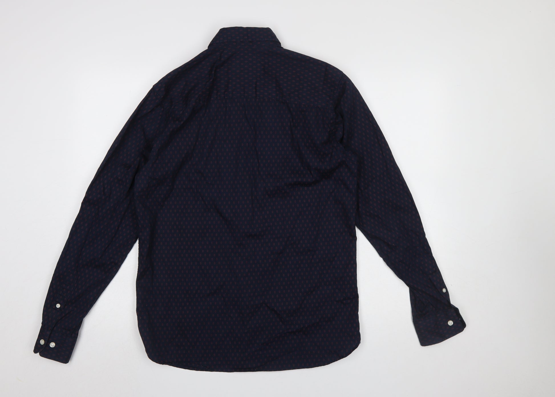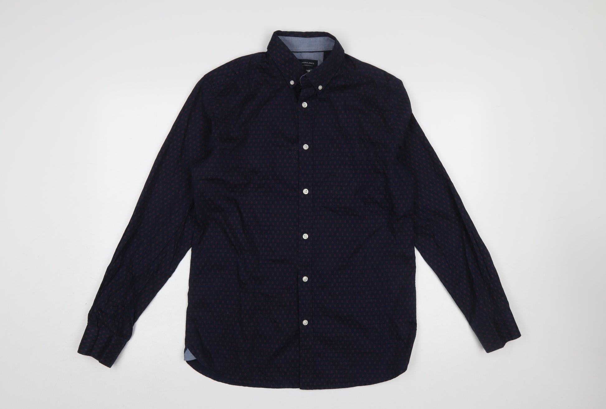 This Jack & Jones Premium men's shirt is a stylish and versatile addition to any wardrobe. Crafted from 100% cotton, it offers breathable comfort and a soft feel ideal for layering or standalone wear across multiple seasons. The shirt features a charming geometric pattern in deep blue with subtle red detailing, delivering a contemporary yet classic look that’s perfect for casual outings or smart-casual occasions. The button-down collar adds structure while maintaining a relaxed aesthetic, making it suitable for wearing both open with a t-shirt or buttoned up for a polished finish.The regular fit ensures comfort and flexibility, flattering a range of body types without restriction. White button accents along the front and cuffs enhance its clean, refined appearance, while the long sleeves and woven fabric construction make it appropriate for spring through autumn wear. The overall design is topped with fine JACK & JONES craftsmanship, synonymous with quality and enduring style.This shirt is in excellent pre-owned condition with only minimal signs of gentle wear, showing no stains or tears. Easy to care for and machine washable, it offers both practicality and enduring appeal.Perfect for pairing with chinos, jeans, or tailored trousers, this piece transitions seamlessly from daytime errands to evening gatherings. Whether you’re dressing for casual Fridays at work or weekend social events, its smart-casual versatility ensures you’ll always look put-together without sacrificing comfort.A great choice for men seeking everyday style with premium detailing, this Jack & Jones shirt reflects tasteful simplicity and modern confidence — an effortlessly cool wardrobe staple at a superb price.