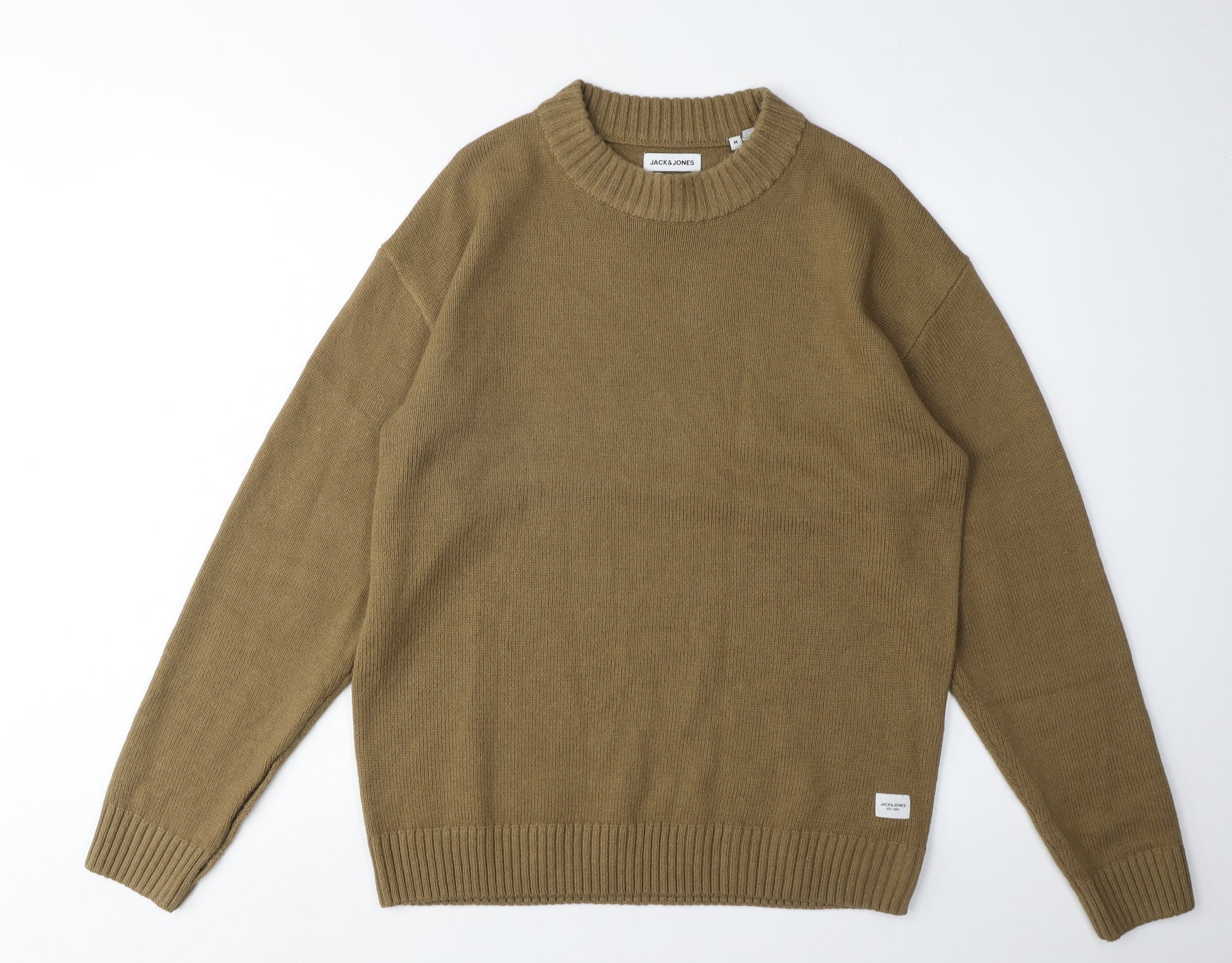 Discover the perfect blend of style and comfort with this Jack & Jones brown knitted pullover jumper. Crafted from a high-quality mix of 70% acrylic and 30% cotton, this tight-knit pullover is designed for ultimate warmth during the chilly autumn and winter months. Featuring a classic crew neck and regular fit, it offers a timeless look that can easily be paired with your favourite jeans or chinos for a casual outing. The solid brown shade complements various outfits, making it a versatile addition to your wardrobe. Despite its excellent construction, please note a minor dark stain, which is hardly noticeable and offers the piece character and authenticity. Ideal for casual occasions, this is a must-have for any fashion-forward individual seeking practicality without compromising style. Machine washable for effortless care, this jumper ensures you stay comfortable and stylish throughout the seasons.