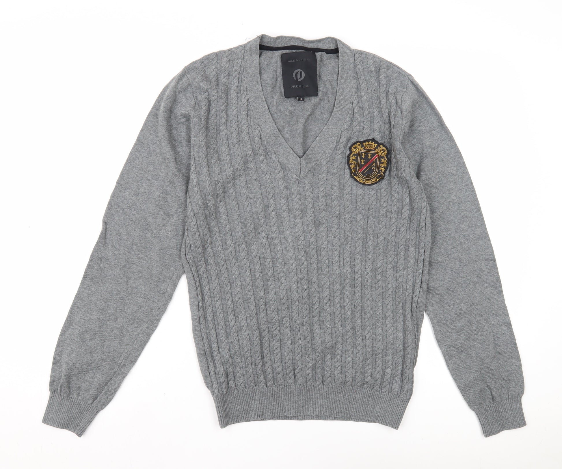 Discover warmth and style with this classic grey pullover jumper from Jack & Jones, perfect for elevating your casual wardrobe. Tailored for men, this medium-sized knit comes with a classic V-neck design, ensuring a flattering fit. Its cable-knit style adds depth and character, making it a versatile addition to any outfit. The jumper features a subtle logo accent, adding a touch of brand elegance while maintaining an understated look. Constructed from a durable fabric blend that incorporates 50% wool and 50% cotton, this piece promises both comfort and warmth, ideal for the cooler seasons of autumn and winter. Whether paired with jeans for a relaxed day out or layered over a shirt for a smart-casual event, this jumper offers excellent versatility. Designed for regular fit, it provides comfort without compromising on style. Machine washable for your convenience, it ensures easy care and longevity. With a theme of classic sophistication, this jumper is crafted to suit various casual occasions, seamlessly taking you from a day at the office to a leisurely weekend gathering. Elevate your knitwear collection today with this distinguished piece from a trusted brand.