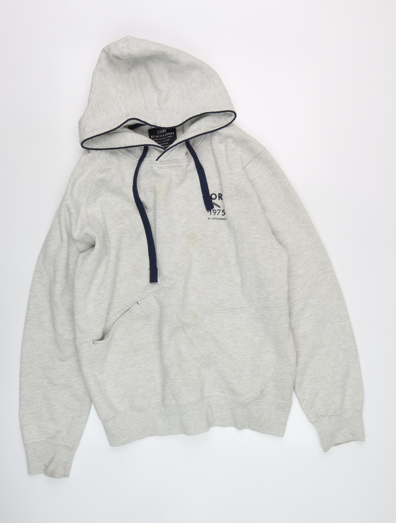 Upgrade your casual wardrobe with this comfortable and stylish Jack & Jones Men's Grey Pullover Hoodie, perfect for autumn and winter. Available in a versatile XL size, this hoodie is crafted from a soft jersey blend of cotton and polyester, ensuring both comfort and durability for everyday wear. Designed in a classic grey shade, it features a logo accent, adding a touch of brand recognition to your outfit. The hoodie incorporates a practical drawstring closure and a crew neckline for a relaxed yet secure fit, making it a great choice for layering over your favourite tees. Long sleeves and a cosy hood offer extra warmth during cooler seasons, while the addition of pockets provides a handy spot for keeping essentials close and your hands warm. Machine washable for easy-care maintenance, this hoodie is an essential piece for every man's wardrobe. Despite showing signs of wear and some stains, this Hoodie remains in good condition and is a fantastic option for laid-back days or casual outings. Discover comfort and style with this Jack & Jones Pullover Hoodie, whether you're lounging at home or heading out for a casual get-together with friends.