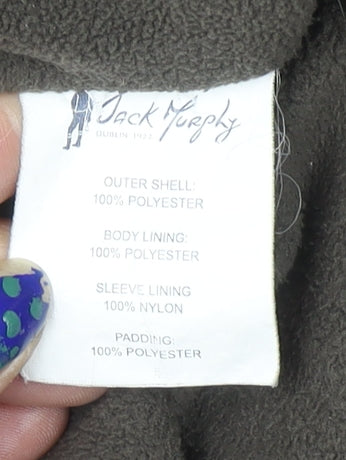 Step out in timeless style and comfort with this Jack Murphy men’s brown quilted jacket, designed for everyday wear through the colder months. Crafted from 100% polyester, the outer shell provides reliable durability and resistance to light wind and chill, while the padded polyester filling ensures the right level of insulation for those brisk autumn and winter days. The design features a smart quilted pattern that adds texture and shape to the mid-length cut, creating a refined yet rugged country look perfect for both town and countryside adventures.Inside, the jacket is fully lined with soft polyester fleece for comfort and warmth, while the sleeves are finished in nylon to allow for ease of movement and layering. Functional details include two front pockets trimmed with brown fabric for a contrasting touch, a stand-up collar for extra protection, and convenient snap and zip closures for practicality and style. The regular fit ensures a comfortable and flattering silhouette, suitable for layering over jumpers or shirts.Perfect for walking, hiking, travel or simply day-to-day casual wear, this versatile coat combines sophistication with outdoor readiness. The earthy brown colour complements a range of outfits and fits seamlessly into any wardrobe, from countryside strolls to weekend getaways. The subtle red embroidered logo on the chest adds a signature accent of understated Irish heritage, reflecting Jack Murphy’s long-standing tradition of quality outerwear since 1922.This jacket is in excellent pre-owned condition with only light signs of wear, showing careful handling and no visible damage or flaws. It’s machine washable for easy care, making it both practical and stylish for men who appreciate functional fashion. With its combination of quilted structure, insulating properties, durable build, and timeless look, this Jack Murphy jacket promises warmth and sophistication in equal measure – a reliable companion for the modern man who values comfort, utility, and heritage craftsmanship.