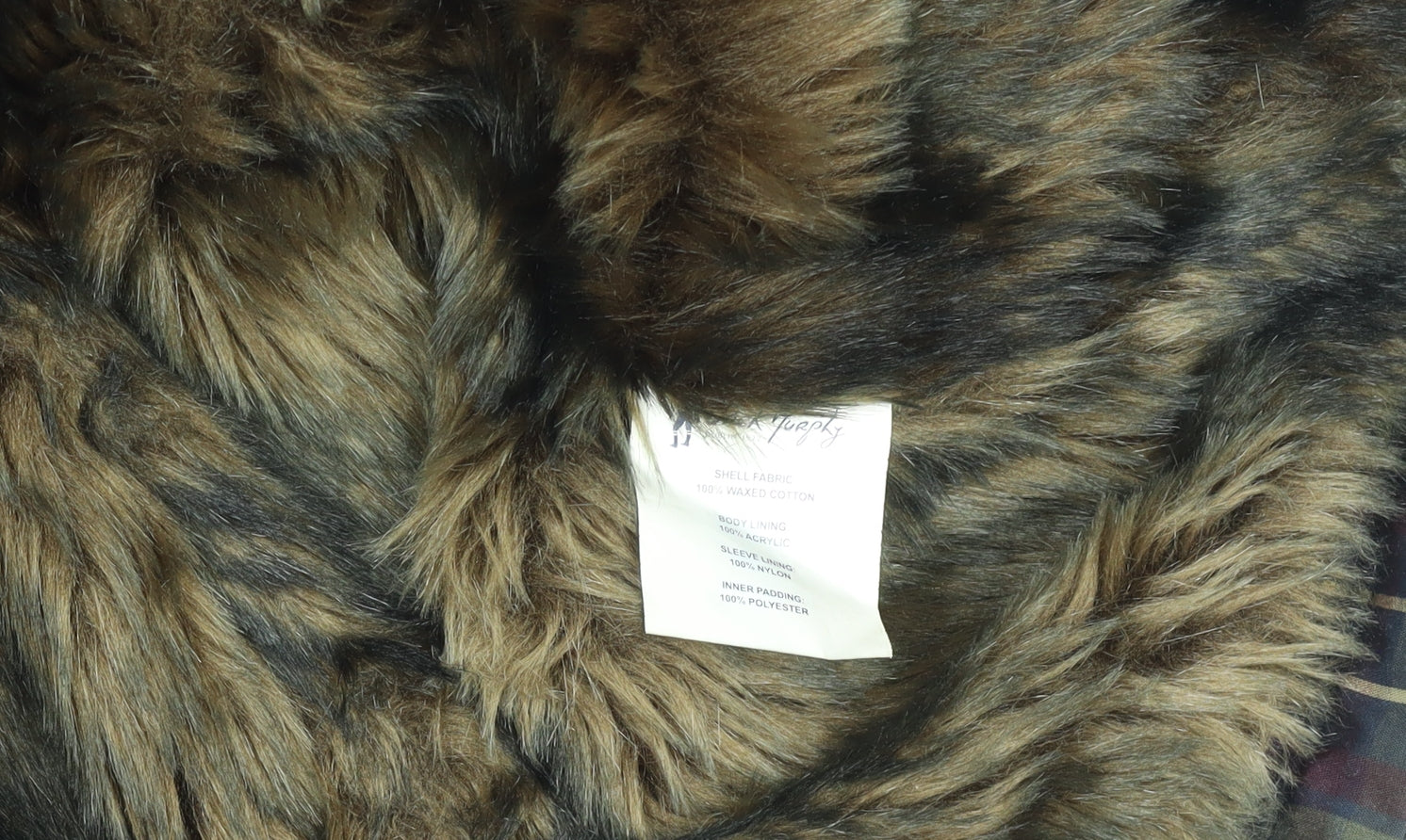 This stylish Jack Murphy women's jacket exemplifies timeless outdoor elegance with a touch of traditional Irish design. Crafted from durable waxed cotton, it offers superior water resistance and durability, ensuring protection in unpredictable British weather. The mid-length cut provides flattering feminine coverage while maintaining practical versatility, easily transitioning from countryside walks to casual city outings. The classic black waxed outer shell is paired with a soft, fully lined interior, featuring a faux-fur fleece lining made from acrylic and nylon for extra warmth and comfort. A polyester-padded inner layer enhances insulation, making it perfect for cooler months during autumn and winter. The structured silhouette is complemented by a corduroy-style collar and brass button accents, adding a refined vintage charm. Functional details include secure front button and zip closure, multiple spacious pockets for convenience, and windproof and waterproof properties for practical wear. Designed for women who appreciate both heritage craftsmanship and modern functionality, this jacket embodies Jack Murphy’s renowned Irish outdoor tradition. Ideal for country pursuits, travel, and everyday wear, it maintains a versatile classic aesthetic that pairs beautifully with denim, boots, or layered knitwear. In very good condition, showing only minimal signs of gentle use, this jacket promises both style and longevity. Durable, elegant, and exceptionally comfortable, it’s an essential outerwear choice for the sophisticated yet adventurous woman seeking practicality without compromising on heritage-inspired fashion. This piece reflects Jack Murphy's meticulous attention to quality and detail, ensuring it remains a wardrobe favourite for many seasons ahead.