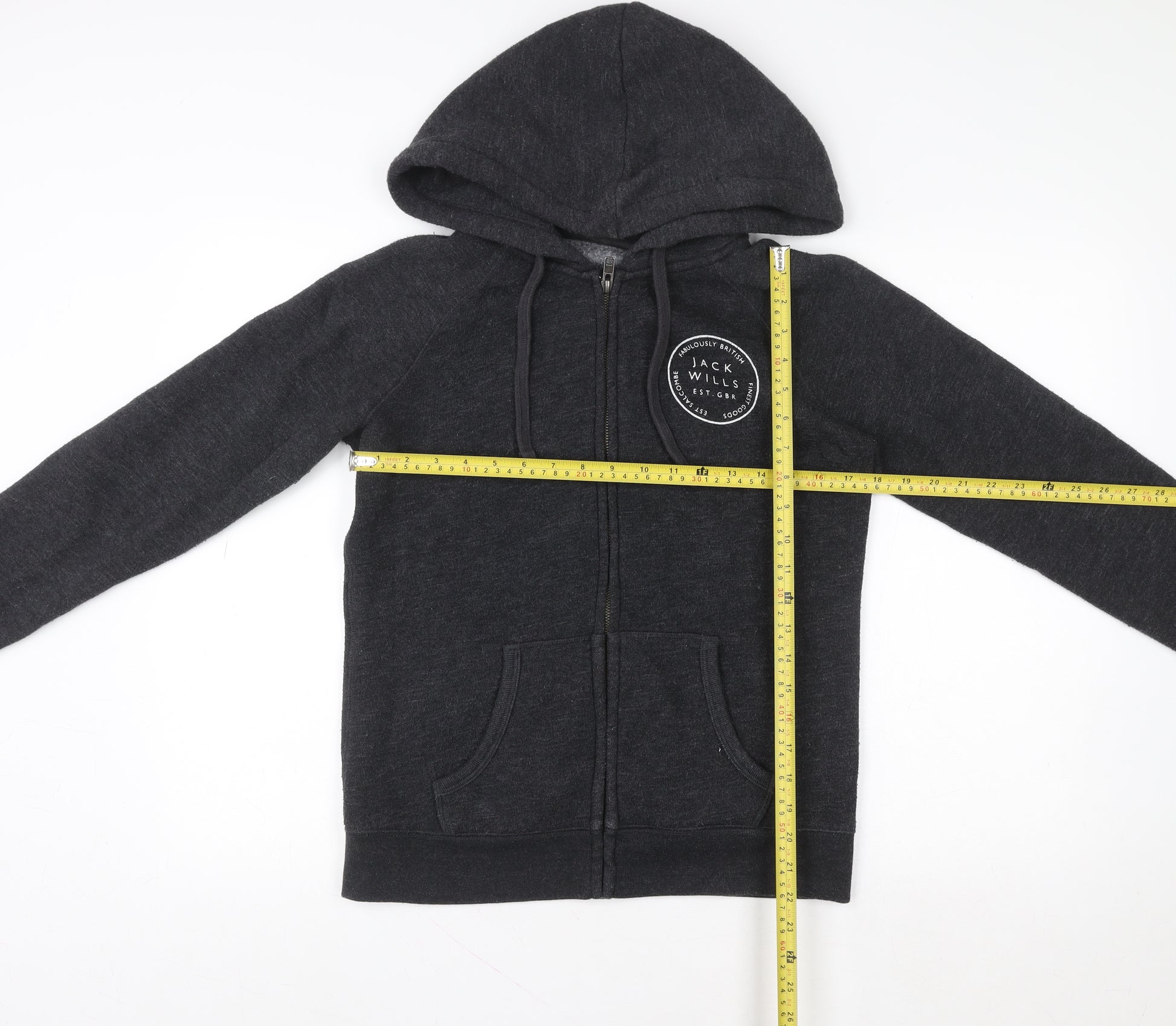 Stay effortlessly casual and warm with this classic Jack Wills men’s black full zip hoodie. Crafted from a soft blend of 65% polyester and 35% cotton, this fleece-lined hoodie provides excellent comfort and everyday versatility. The medium-weight fabric makes it ideal for year-round wear, whether you’re layering it up in the colder months or throwing it on over a t‑shirt during spring or evening strolls. Designed in a timeless full zip style, it features a drawstring hood and ribbed cuffs for added comfort and shape retention. The minimalist design is complemented by the iconic Jack Wills logo badge on the chest, giving it a smart collegiate look that pairs well with jeans, joggers, or casual trousers. The front kangaroo pockets provide practical storage or a cozy place to keep your hands warm. This zip-through hoodie is perfect for casual outings, gym sessions, or simply relaxing at home. With a dependable construction and soft fleece touch, it blends laid-back British style with everyday functionality. The black shade ensures easy coordination with any outfit, while the regular fit gives a relaxed yet polished silhouette. In excellent condition with only minimal signs of wear, this hoodie combines durability and classic quality appeal at a great value. Ideal for men who appreciate comfort, versatility, and understated branding. Snap it up for the perfect weekend layer that delivers on both warmth and effortless style. Whether heading to college, into town, or kicking back at home, this Jack Wills piece is an easy wardrobe favourite that will last season after season.