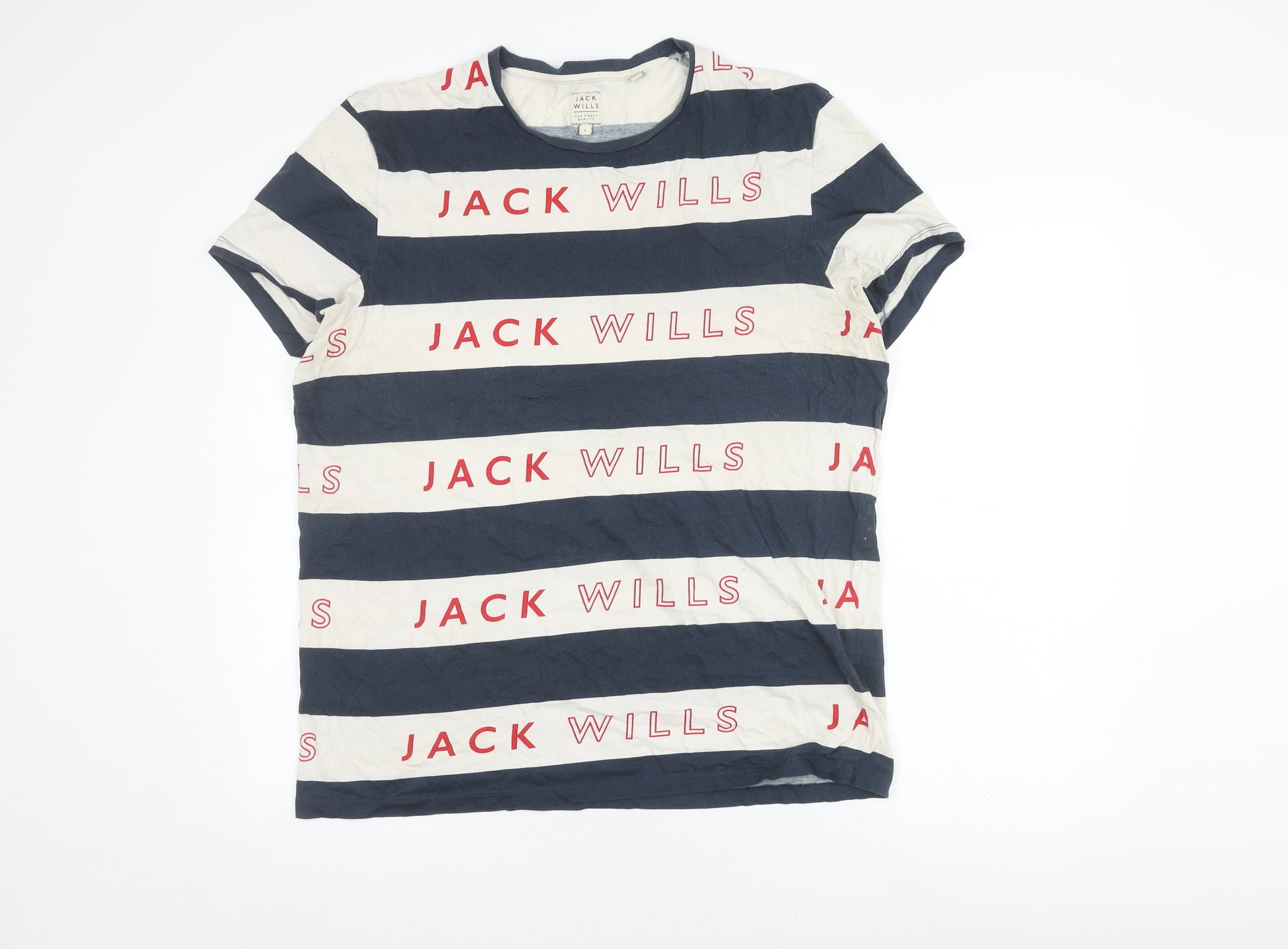 Elevate your casual wardrobe with this Jack Wills Men's T-Shirt, perfect for all seasons. Crafted from 100% cotton, this short-sleeve crew neck T-shirt ensures comfort and breathability, making it a go-to staple for everyday wear. Featuring a timeless blue and white striped pattern, this regular-fit top is defined by bold logo accents, lending a distinctive touch to your ensemble. Ideal for pairing with jeans or chinos, this versatile piece offers effortless style with its clean lines and modern design. Whether you're heading out for a relaxed day with friends or running errands around town, this T-shirt promises to keep you comfortable and stylish. Embrace the classic Jack Wills aesthetic with this must-have addition to your wardrobe. Machine washable for easy care, this item is in excellent condition, showing hardly any signs of wear aside from slight wrinkling. Make a smart fashion choice with this iconic piece today, available now at an unbeatable price.
