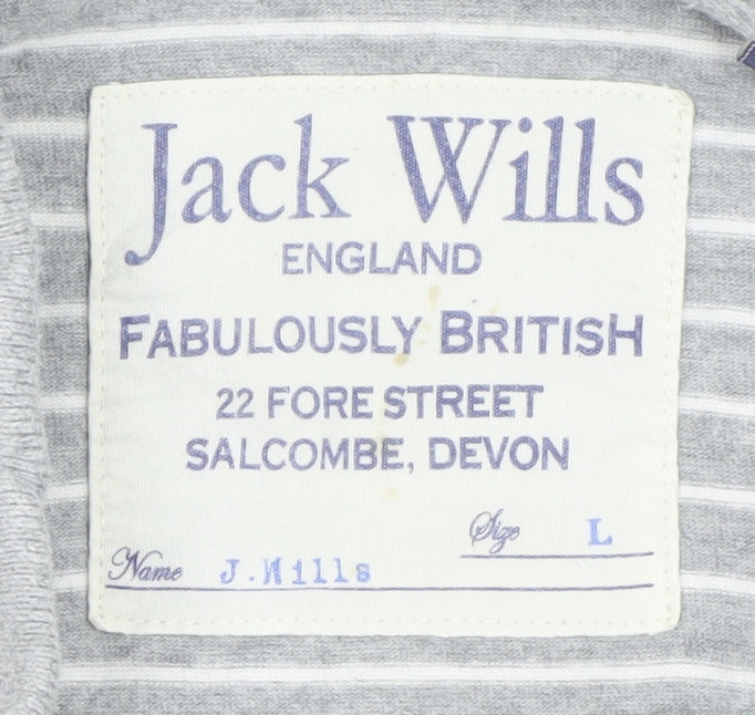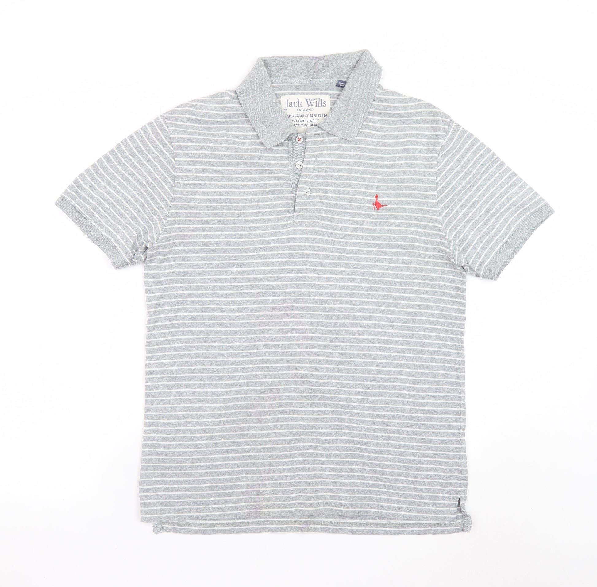 Elevate your casual wardrobe with this stylish Jack Wills men’s polo shirt in a timeless grey and white striped design. Crafted from 100% cotton, this polo offers a lightweight, breathable feel that ensures all-day comfort and effortless wear. The collared neckline and button fastening add a classic touch while giving it a clean, polished look. Made to reflect Jack Wills’ British heritage, the design embodies relaxed sophistication suitable for both everyday wear and smart-casual occasions. The soft cotton jersey material provides durability and ease of care, making it a practical addition to any collection. Featuring a subtle embroidered pink pheasant logo on the chest, it carries the brand’s signature detailing that subtly enhances its overall appeal. The short-sleeve structure makes it ideal for warmer months, while the neutral grey shade with fine stripes complements a variety of outfits — from chinos and jeans to shorts. This shirt is perfect for weekend outings, golf sessions, or relaxed social gatherings where comfort meets understated style. In very good pre-owned condition, it shows minimal signs of wear with only slight fading, maintaining a great look and feel. The regular fit offers a flattering, comfortable silhouette that suits most body types. Easy to wash and maintain, this polo combines style, quality, and versatility, representing the casual yet refined Jack Wills aesthetic. A dependable choice for modern men who value smart simplicity, this item blends function and fashion perfectly, ensuring it remains a go-to wardrobe favourite for seasons to come.