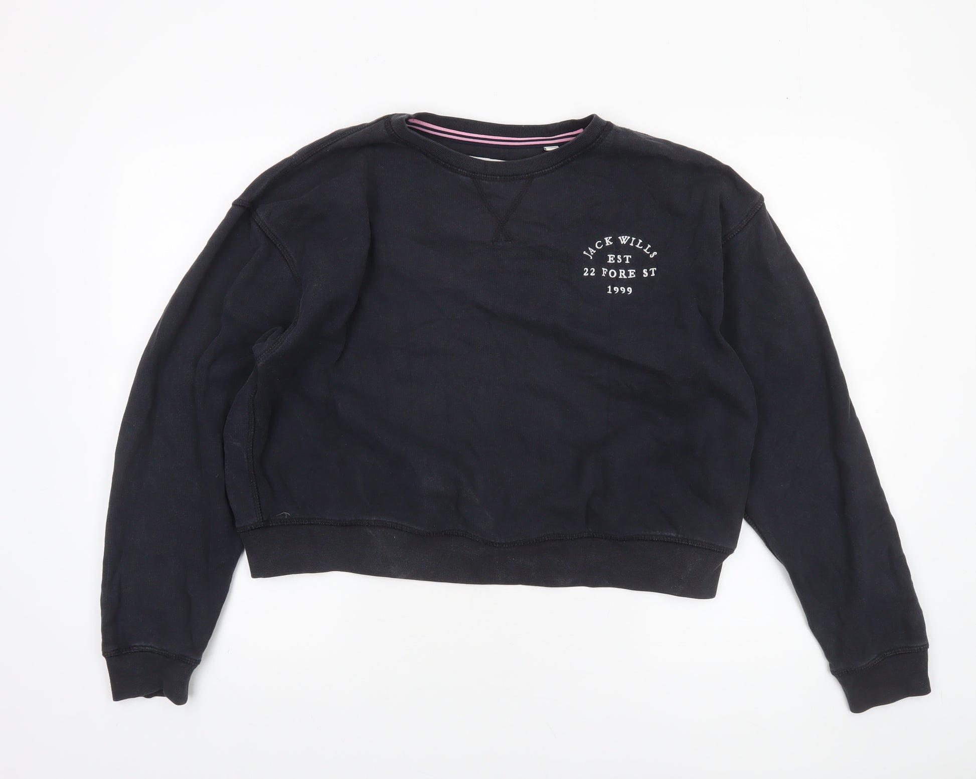 This stylish Jack Wills women's sweatshirt blends effortless comfort with timeless design, perfect for laid-back everyday wear. Crafted from soft, breathable 100% cotton, it ensures lasting comfort and a casual fit ideal for layering throughout the year. The black colourway offers versatile pairing options, while the classic crew neckline and long sleeves create a relaxed silhouette suitable for any casual outing. Featuring the Jack Wills signature 'Fabulously British' logo print on the chest, this sweatshirt embodies understated elegance with a hint of heritage charm. Designed for the modern woman who values both comfort and quality, its lightweight jersey construction keeps it supple and easy to wear through the cooler months of autumn, spring, and winter. The ribbed cuffs and hem deliver a flattering fit while holding the garment’s shape over time. Whether paired with jeans for a relaxed weekend look or layered over a collared shirt for a smart-casual edge, this piece embodies effortless British style. Ideal for casual occasions, travel, or off-duty days, this sweatshirt makes a versatile addition to any wardrobe. In very good pre-owned condition with only gentle signs of previous wear and slight fading consistent with natural use, it remains a fantastic quality garment at a great price. Perfect for those who appreciate classic Jack Wills styling and everyday comfort.