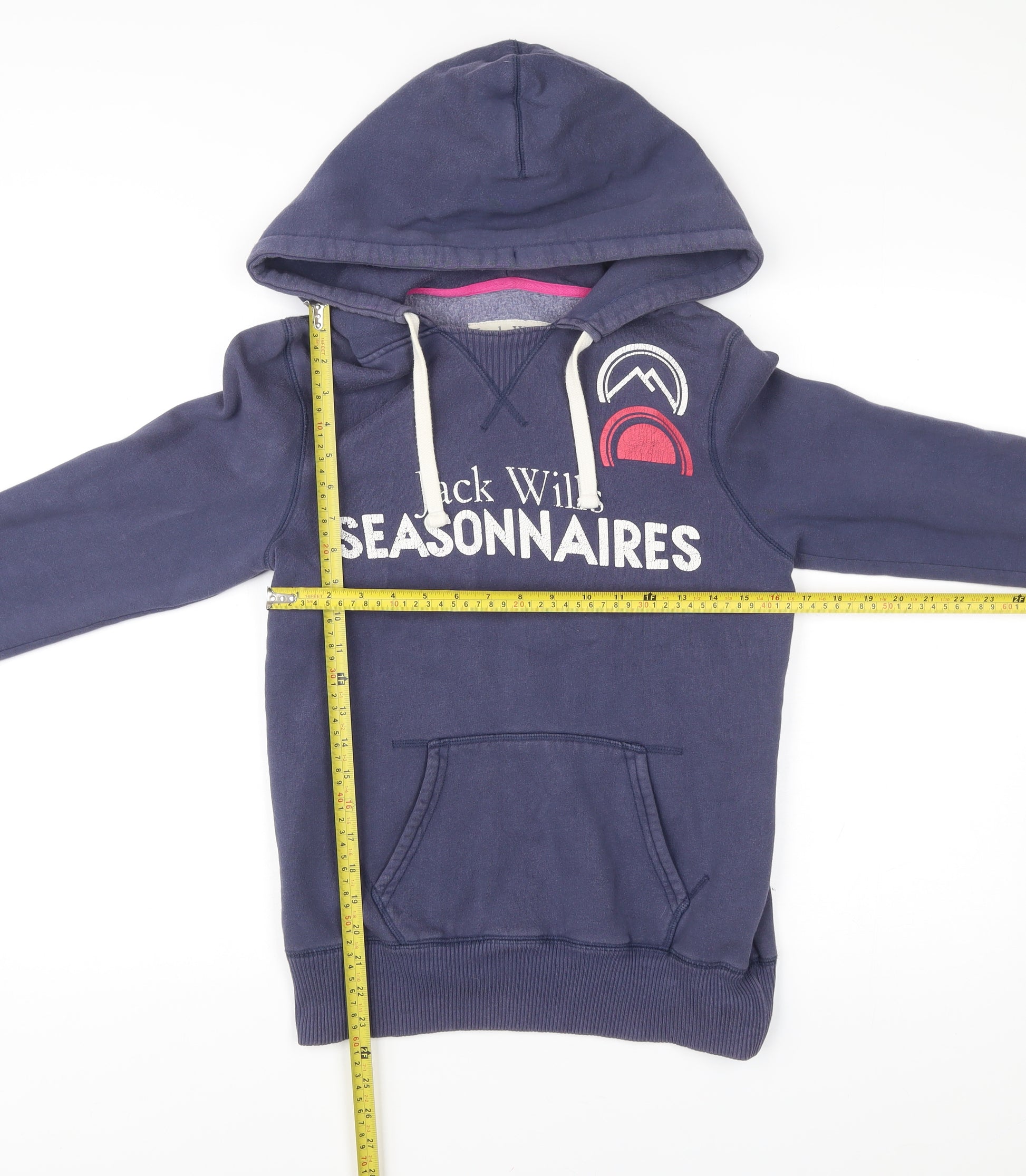 This Jack Wills women’s hoodie is a versatile and stylish choice for casual wear, combining comfort with the brand’s instantly recognisable British-inspired design. Made from a cosy blend of 76% cotton and 24% polyester, this hoodie features a soft fleece fabric that provides warmth and durability without compromising on comfort. Designed in a pullover style, the hoodie comes in a timeless navy blue shade, making it easy to pair with jeans, leggings, or even activewear for a relaxed everyday look.The piece features classic hoodie elements, including a drawstring hood for adjustable comfort, a roomy front kangaroo pocket for practicality, and ribbed trims on the cuffs and hem for a secure fit. The standout design comes in the form of bold graphic prints across both front and back — with the Jack Wills ‘Seasonnaires’ branding and a vibrant phrase that adds character and individuality to the hoodie. This attention to detail gives it a youthful, fun edge, making it perfect for both lounging and on-the-go wear.The raglan sleeve design ensures ease of movement and a comfortable fit across the shoulders, while the regular fit silhouette makes it flattering and suitable for layering. Its crew neckline enhances comfort and provides a classic structure that remains effortless to wear from season to season.Ideal for autumn, spring, and winter, this Jack Wills hoodie is well-suited for casual outings, school, travel, or outdoor activities such as walking and hiking. Though pre-loved, it remains in very good condition, showing only light wear with some natural fading to the graphic print, which adds to its relaxed charm.A perfect blend of style and practicality, this hoodie is a wardrobe essential for women who enjoy quality loungewear with a distinct personality. Practical yet stylish, this hoodie is an easy choice for layering during cooler weather, ensuring both cosiness and character.Don’t miss the chance to add this versatile Jack Wills hoodie to your collection — a must-have for those who love casual wear with a touch of fun.