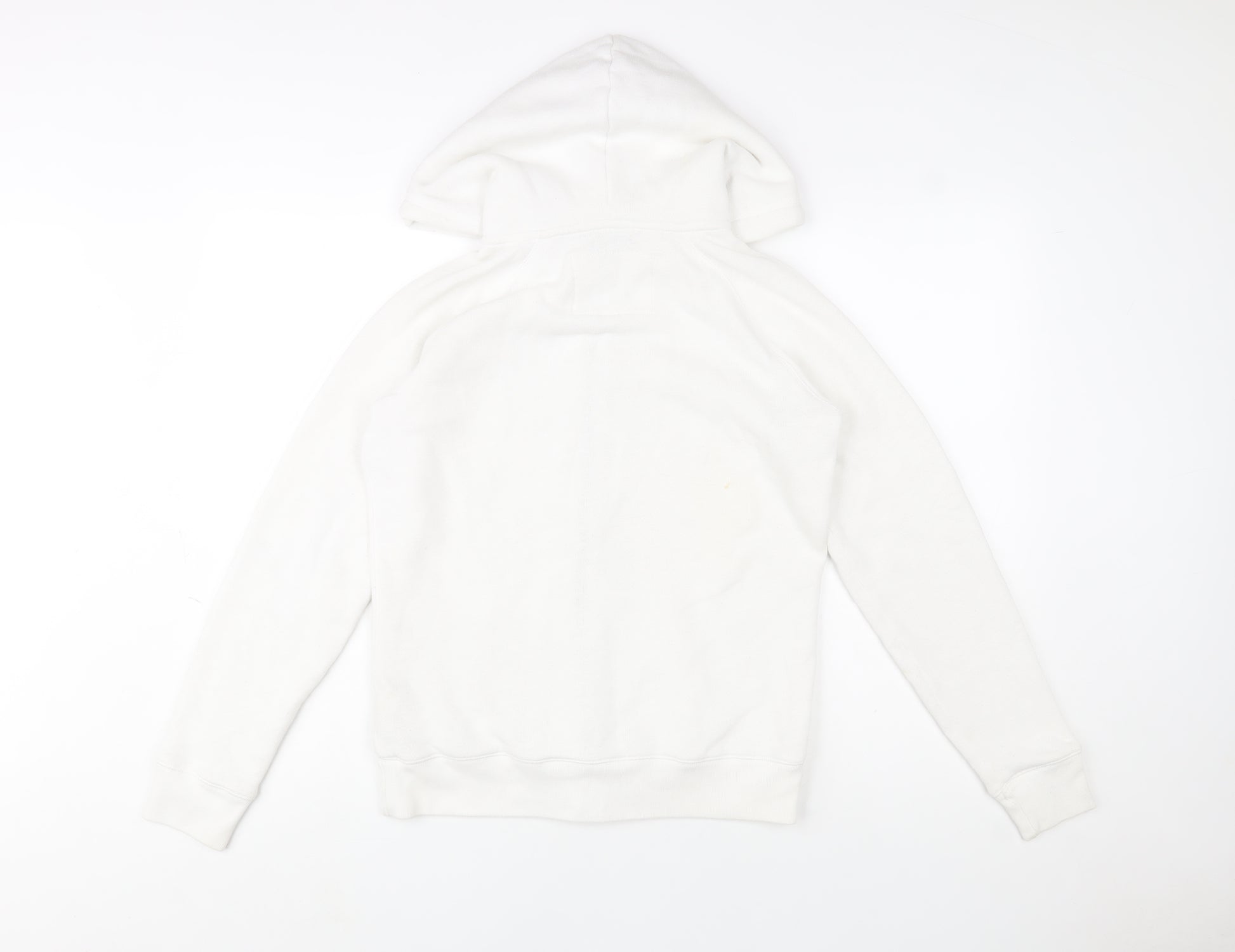 This Jack Wills women’s white hooded fleece jacket is a timeless and versatile addition to any wardrobe. Designed in a regular fit, it offers a snug yet comfortable feel, perfect for layering during cooler months or wearing casually on its own. Made from a soft 55% cotton and 45% polyester blend, the fabric ensures lasting comfort and durability while maintaining an effortlessly stylish appearance. Featuring a full zip closure, practical front pockets, and an adjustable drawstring hood, this jacket combines functionality with classic design. The clean white colour gives it a fresh, minimalist look that pairs effortlessly with jeans, leggings, or joggers. The inner lining of soft fleece provides insulation and warmth, making it an excellent choice for activities such as walking, gym sessions, travelling, or simply relaxing at home. Manufactured with high-quality craftsmanship, typical of Jack Wills’ University Outfitters collection, this piece captures the brand’s signature laid-back British style with a subtle logo detail on the chest. Although in very good pre-loved condition, it features a small, faint mark on the back, which is reflected in the affordable price. This jacket is machine washable for easy care. Perfect for autumn, winter, and early spring, it’s a wardrobe staple for women seeking comfort, warmth, and style all in one piece. Whether you’re heading to a casual lunch, running errands, or keeping warm post-workout, this white hooded fleece jacket is a reliable and fashionable choice. Add this quality Jack Wills jacket to your collection today to experience the ideal balance of practicality and modern design with a classic British twist.