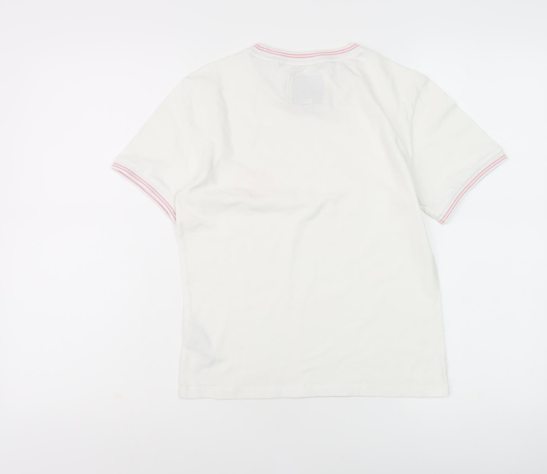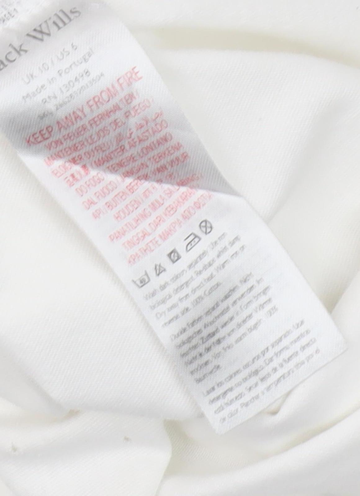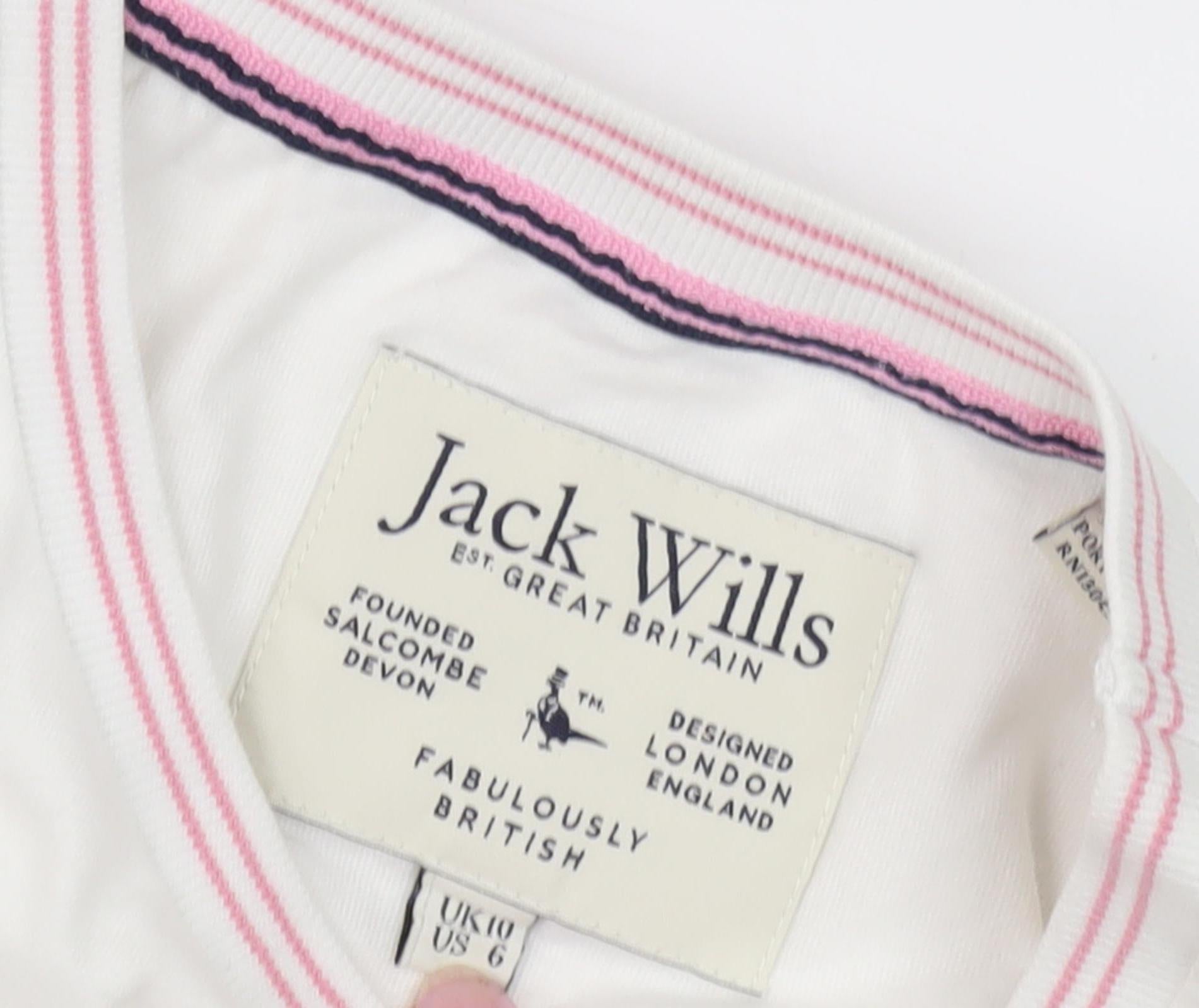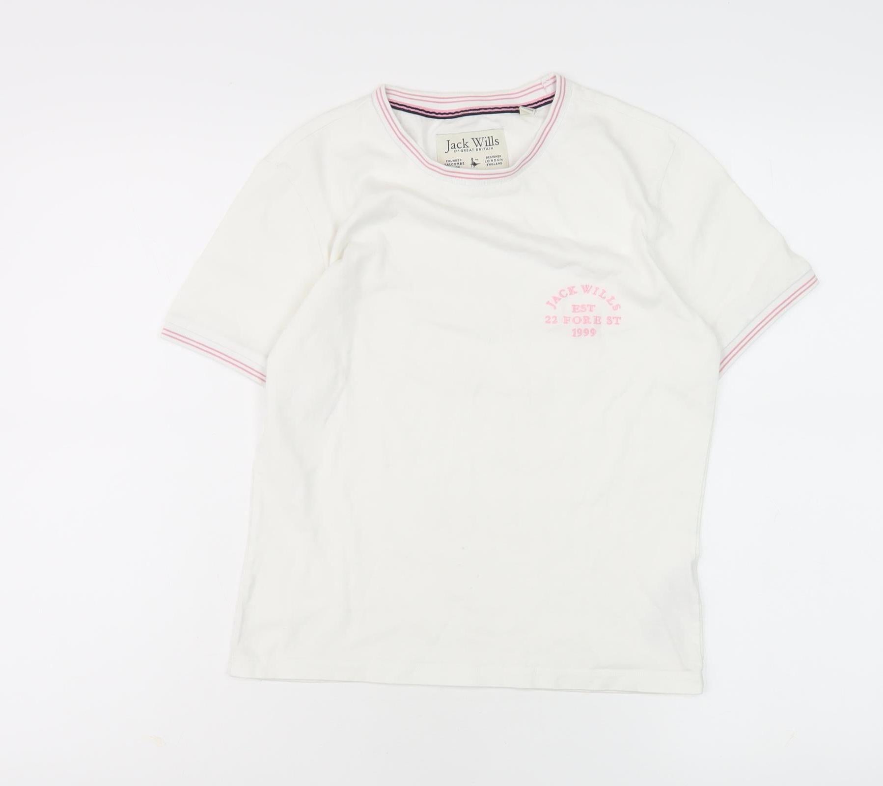 Discover timeless style with this Jack Wills women's T-shirt, perfect for casual outings and everyday wear. Designed in Great Britain, this white crew neck T-shirt in UK size 10 embodies laid-back elegance. Crafted from 100% cotton, it promises comfort and breathability, making it ideal for all seasons. With short sleeves, it pairs effortlessly with jeans or shorts, making it a versatile addition to your wardrobe.The solid white colour and classic/fitted sleeve add a touch of refinement, while the machine-washable feature ensures ease of care. Despite showing minor marks on the fabric, it retains its charm and durability, offering you great value for casual outings. This T-shirt is perfect for those looking for a blend of simplicity and quality.Whether you're heading to a brunch with friends or a casual day out, this Jack Wills T-shirt will be your favourite go-to piece. Enhance your wardrobe with this elegant piece and enjoy the unmatched comfort and style it brings to your everyday look.