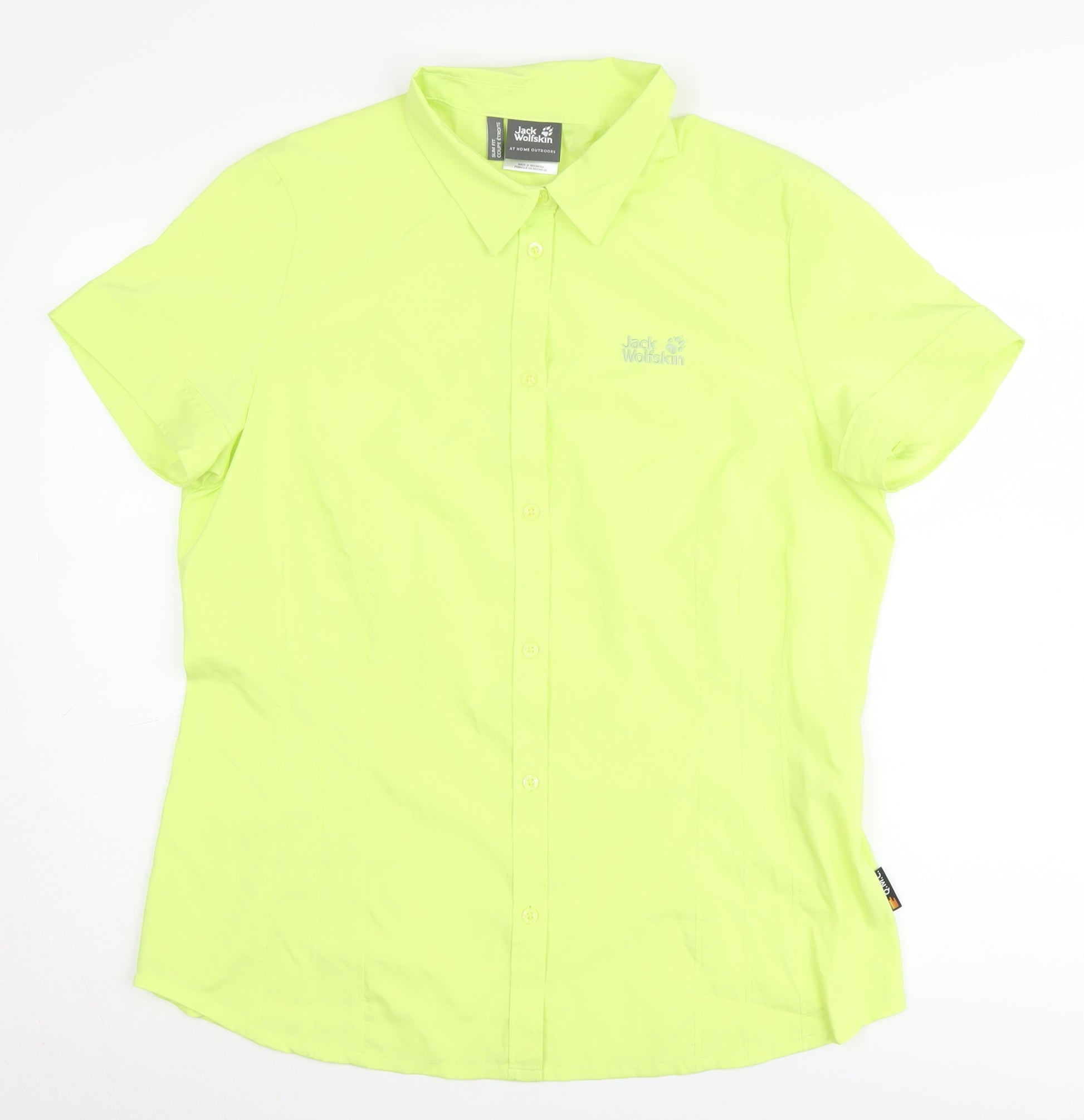 This stylish Jack Wolfskin women's button-up shirt in a vibrant shade of green is perfect for casual wear. Tailored in a slim fit and crafted from 100% polyester, this short sleeve shirt offers comfort and durability. With a classic collared neckline and solid pattern, it is ideal for versatile styling. Whether out on a casual day or meeting friends, this shirt adds a pop of colour and sophistication to your outfit. Machine washable and featuring a button closure, it ensures easy care while maintaining its excellent condition. Add this chic, unisex adult shirt to your wardrobe for a fresh and lively look.