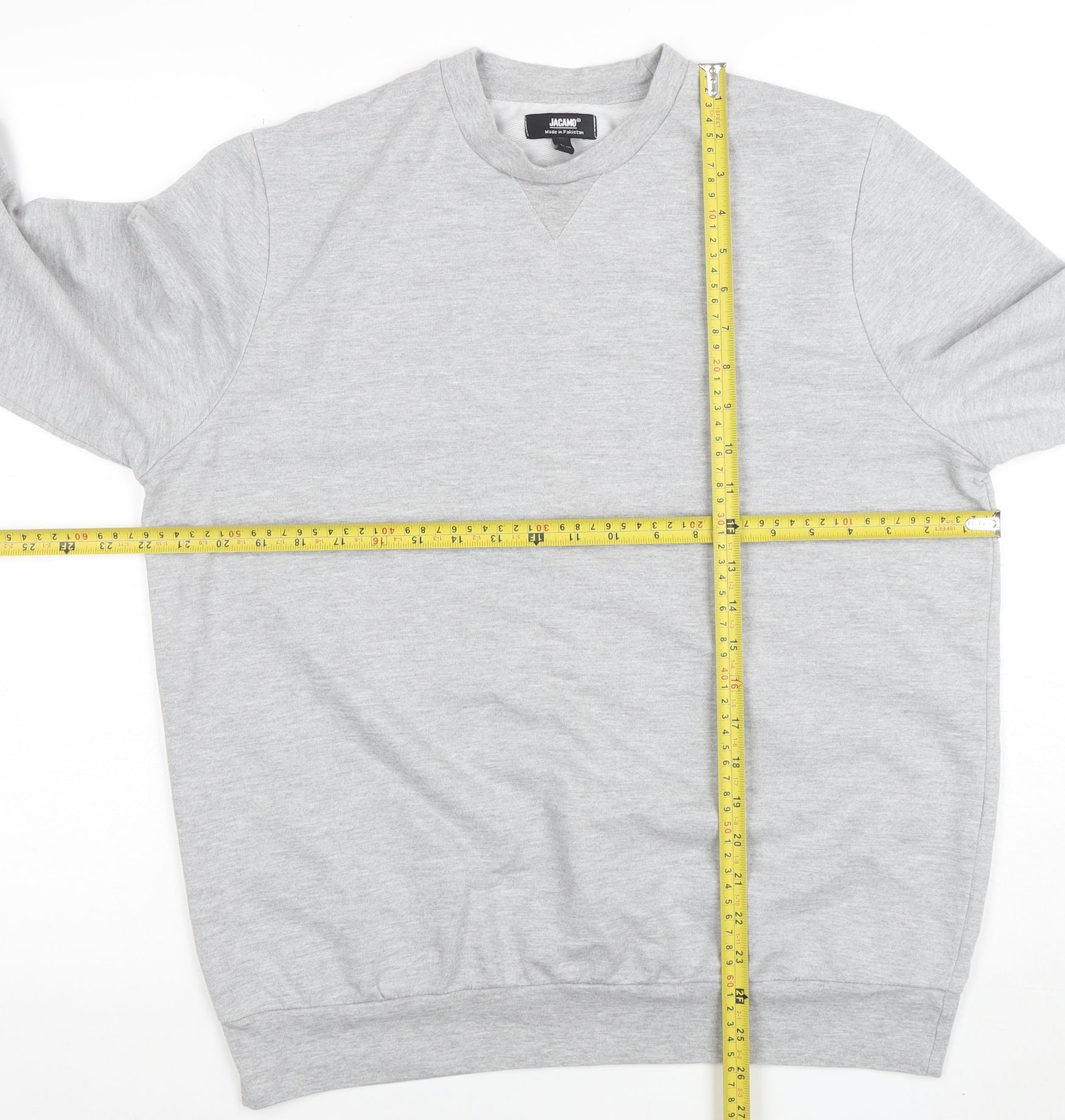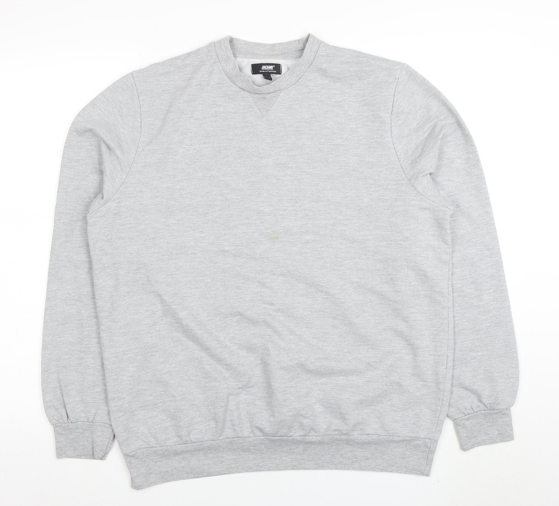 Add a touch of casual comfort to your wardrobe with this Jackamo men’s grey crew neck sweatshirt. Designed with simplicity and versatility in mind, this classic pullover sweatshirt offers a timeless look that pairs easily with jeans, joggers, or shorts. Made from a soft, breathable cotton and polyester jersey blend, it provides a comfortable fit that is both lightweight and ideal for layering in cooler weather. The long sleeves, ribbed cuffs, hem, and collar ensure a snug yet relaxed shape that keeps you cosy throughout the seasons. The neutral grey tone makes it an effortlessly stylish choice for everyday wear, whether you’re lounging at home, running errands, or heading out casually. As part of Jackamo’s range designed for men, this sweatshirt blends quality construction with a laid-back finish, ensuring lasting comfort and durability. The crew neck design delivers a traditional athletic silhouette that suits all shapes, while the regular fit gives you room to move without feeling bulky. Perfect for autumn, spring, and winter, this classic style is an all-seasons piece that coordinates seamlessly with your existing wardrobe. The minimal design and subtle detailing make it suitable for both casual and smart-casual outfits. Machine washable for easy care, it’s a practical yet stylish addition to any collection. Although in very good pre-owned condition, please note there is a small, faint mark on the front that doesn’t detract from its overall appeal. This quality Jackamo sweatshirt represents great value for a dependable everyday essential with a versatile finish. A reliable favourite that offers both comfort and easy style, it’s the piece you’ll reach for time and again when you want effortless warmth and relaxed confidence.