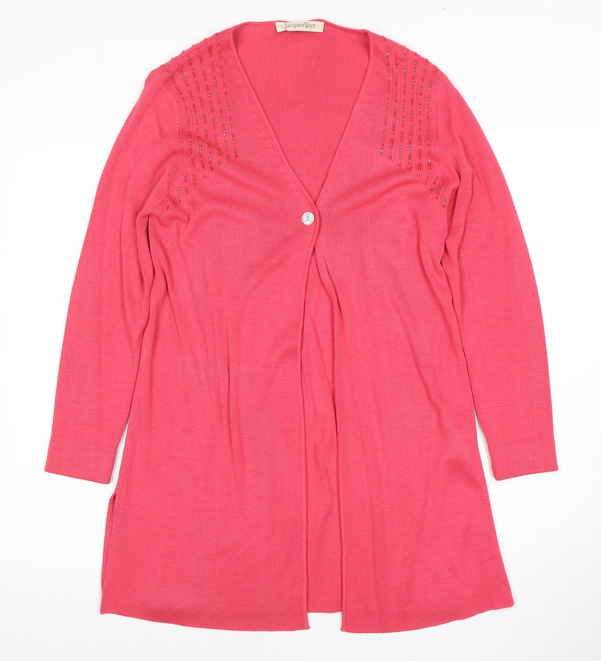 Elevate your wardrobe with this exquisite Jacques Vert pink cardigan, perfect for adding a touch of elegance to any outfit. Designed for women in a small size, this cardigan features a classic V-neckline and long sleeves, offering both style and comfort. The striking pink colour is complemented by delicate beaded accents and a single button closure, adding an element of charm and sophistication. Crafted from a lightweight blend of acrylic and viscose, this cardigan is ideal for casual wear during spring and autumn, providing just the right amount of warmth and comfort. The cardigan is in excellent condition, free from any visible defects, and is best cared for with a gentle hand wash. Its timeless design ensures it can be paired effortlessly with your favourite outfits, making it a versatile addition to your collection. Perfect for casual occasions, this cardigan can be dressed up or down to suit any event. Whether you're heading out for a casual lunch or enjoying a relaxed weekend at home, this cardigan will keep you looking stylish and comfortable. Don't miss the opportunity to own a piece that combines quality craftsmanship with an eye-catching design. Purchase this Jacques Vert cardigan today and experience the perfect blend of fashion and function.