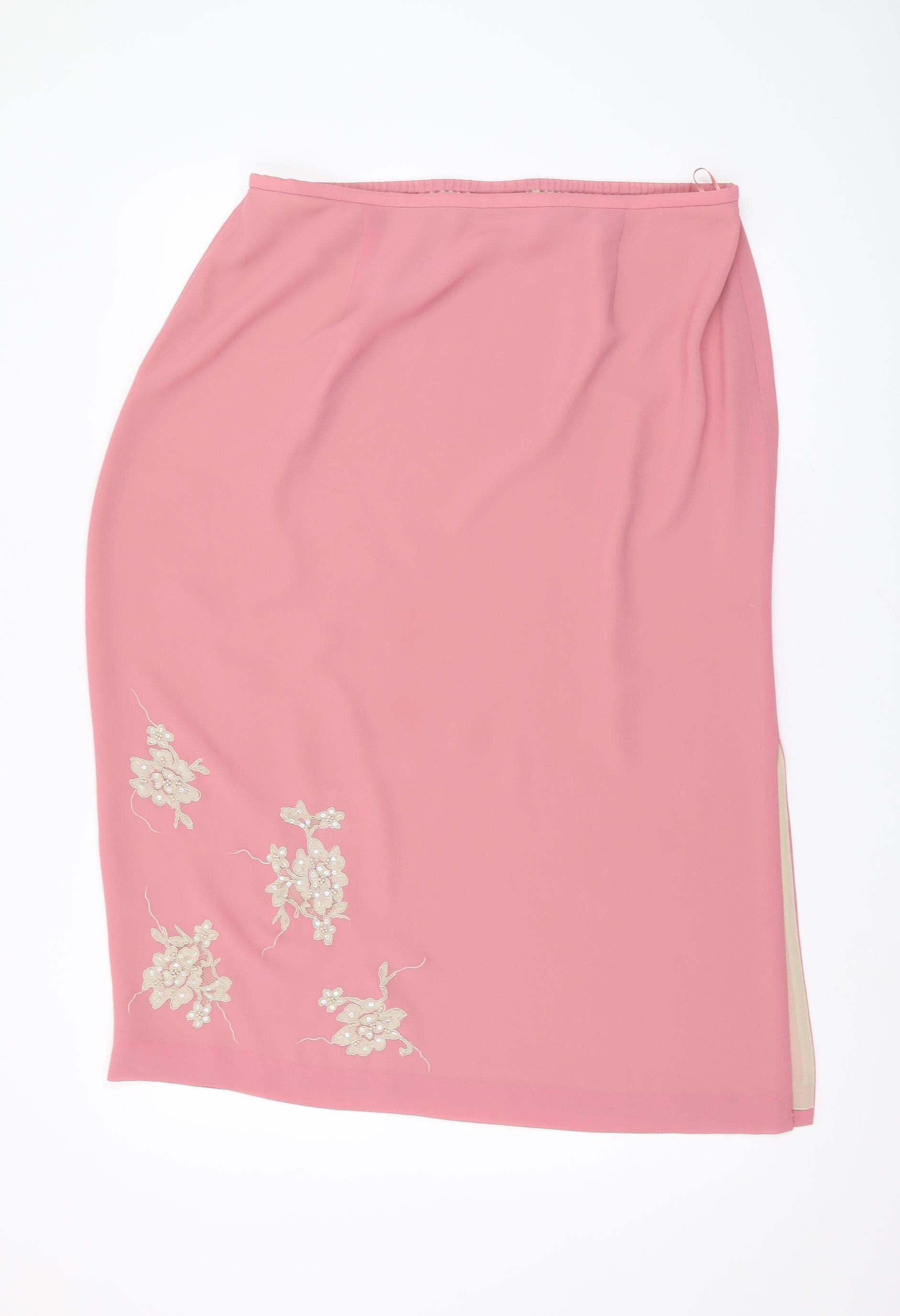 Elevate your formal wardrobe with this exquisite Jacques Vert pink midi skirt. Expertly designed for women, this skirt features a beautiful floral embroidered accent that adds a touch of elegance. Its straight, pencil silhouette provides a classic fit that flatters all body types, while the mid-rise waist ensures comfort. Made from 100% polyester, it promises durability and a soft feel. Ideal for spring and summer occasions, it is perfect for both formal gatherings and sophisticated evenings out. With its elastic waistband, this skirt offers convenience and ease of wear. In excellent condition with no visible wear, it makes a worthwhile addition to anyone seeking style and comfort. Machine washable for hassle-free upkeep, it’s a practical choice for modern women. Don't miss out on this mix of charm and functionality.