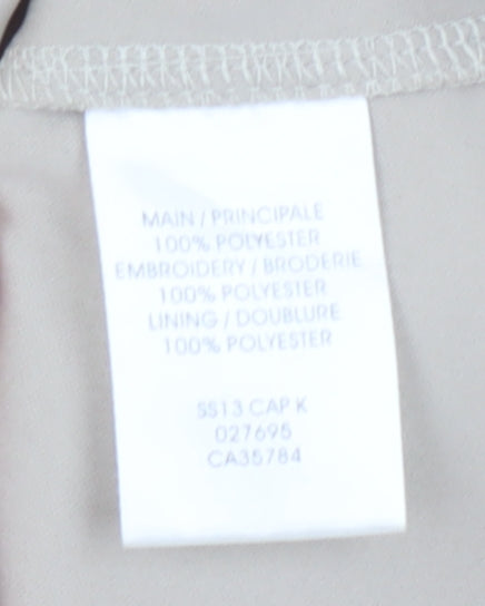 Explore the charm and elegance of the Jacques Vert women's blouse, crafted in a soft beige hue. This timeless piece is suitable for everyday wear and semi-formal occasions, making it a versatile addition to any wardrobe. The 3/4 sleeves and scoop neckline offer a classic silhouette, complemented by the stylish floral embroidered accents that add a touch of sophistication. Made of 100% polyester with a mesh fabric type, this regular fit blouse ensures comfort and style. Despite the small stain at the front, this garment is in very good condition and ready to become a staple in your collection. Ideal for women seeking understated elegance, the Jacques Vert blouse pairs well with both jeans and dressy trousers for diverse styling options.
