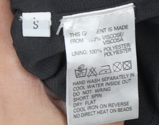 Step out in style with this elegant Jacques Vert Women's Black Beaded Blouse in a size Small. Designed to make you stand out, this exquisite blouse is perfect for any party or cocktail occasion. Its solid black colour with delicate beading adds a touch of sophistication and glamour. Crafted from breathable 100% viscose, the blouse offers comfort and ease of wear. The knit fabric type provides a subtle stretch, ensuring a flattering fit for different body types. Featuring a classic round neck and short, fitted sleeves, it’s designed to enhance your silhouette. This blouse is versatile enough to be worn in all seasons, making it a staple piece in your wardrobe. The pullover closure adds convenience, allowing for easy wear. Hand wash only to maintain the quality and the charm of the delicate beads. Perfect for adding a pop of elegance to your ensemble, pair this blouse with tailored trousers or a sleek skirt. With its high-quality fabric and unique detailing, this blouse embodies the timeless elegance of the Jacques Vert brand. Make a statement at your next event with this stunning piece.