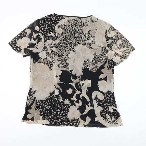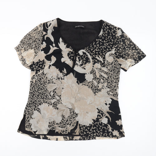 This charming Jacques Vert blouse is an essential for your wardrobe, ideal for adding a touch of elegance to any outfit. Crafted from a luxurious polyester fabric, it promises a lightweight and comfortable fit, perfect for all-day wear. The blouse is exquisitely designed with a black floral pattern, providing a visually appealing contrast that's both stylish and versatile. It's short-sleeved, making it a great option for warmer days, while still being perfect for layering under jackets for cooler evenings. Featuring a flattering V-neckline, this blouse offers a chic and sophisticated look suitable for various occasions, from business meetings to casual outings. Its pullover style ensures ease of wear, allowing you to dress effortlessly in seconds. Although in excellent pre-loved condition, it exhibits no visible defects, ensuring you look your best without compromise. Match this blouse with tailored trousers for a polished look or style it with jeans for a more relaxed approach, making it a versatile addition to your clothing collection. Elevate your fashion game with this must-have piece from Jacques Vert.