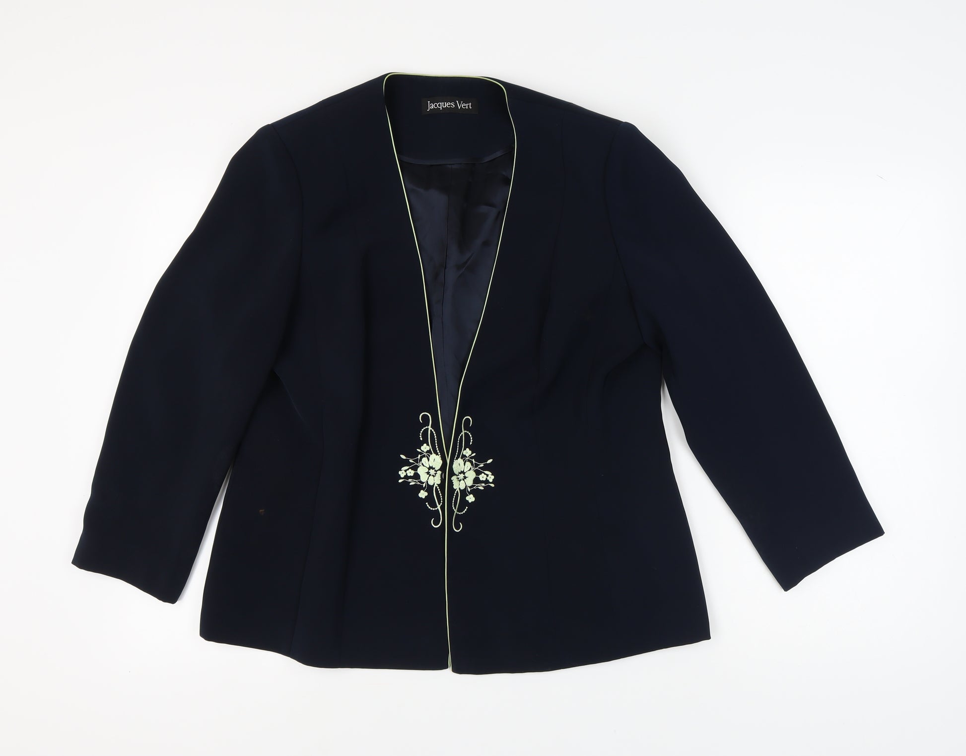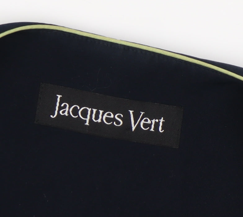Introducing this elegant Jacques Vert suit jacket in a striking blue color, designed for the sophisticated woman seeking style and comfort. This beautifully tailored jacket features a unique floral pattern that adds a touch of femininity and charm, making it perfect for various occasions. Crafted from high-quality polyester, it promises durability and ease of maintenance. The jacket comes fully lined with acetate to provide additional warmth and structure when worn. With its regular length and long sleeves, it offers a flattering silhouette suitable for a range of body types, especially those wearing size UK 16. Although it lacks a front button, its open design allows it to be styled effortlessly with blouses and tops of your choice. Despite being previously owned, it's in very good condition, with only a few visible marks that are barely noticeable. Priced competitively, this piece is an excellent addition to any wardrobe, offering timeless style without compromising on quality. Ideal for casual or semi-formal gatherings, it's a classic choice for fashion-conscious women.