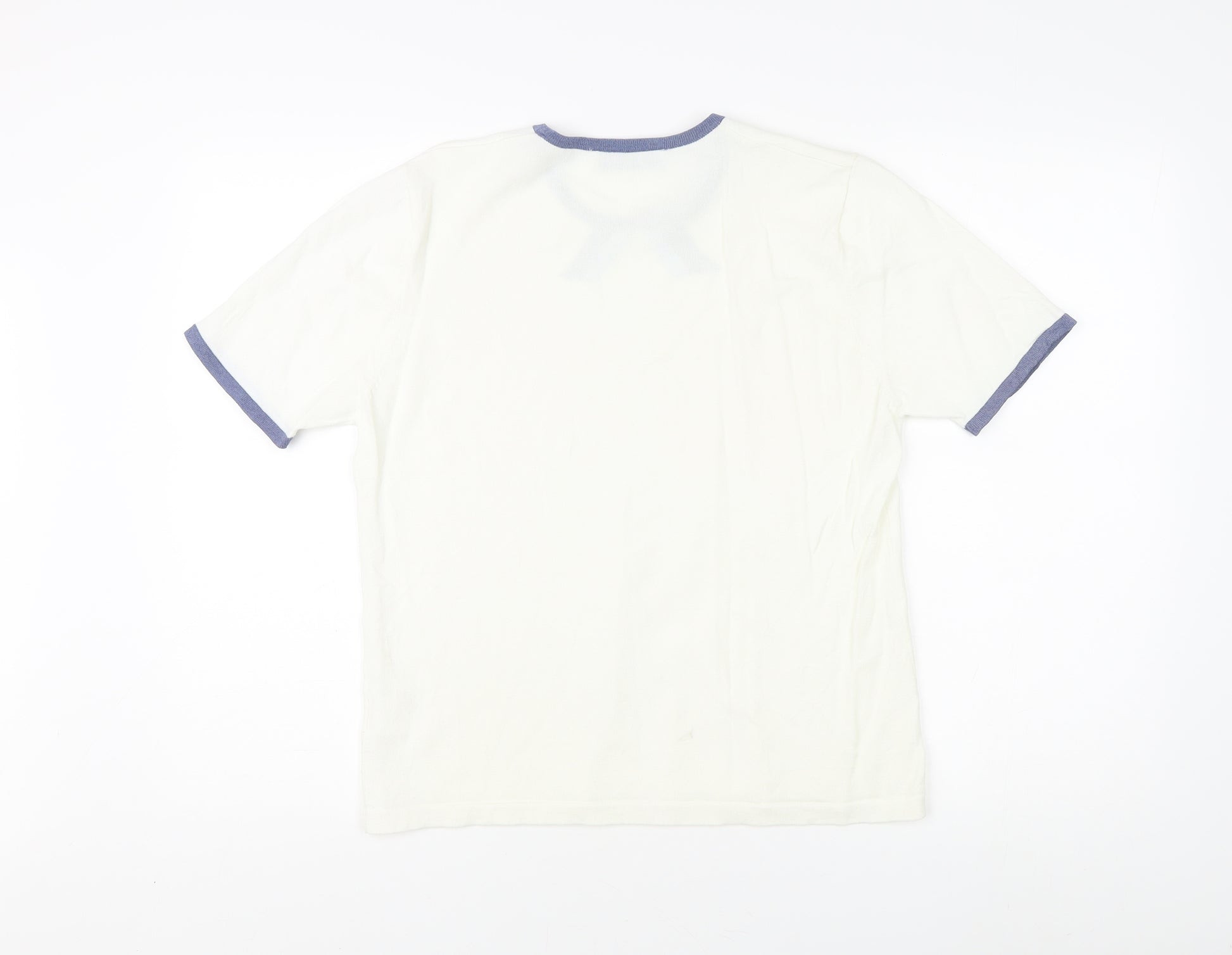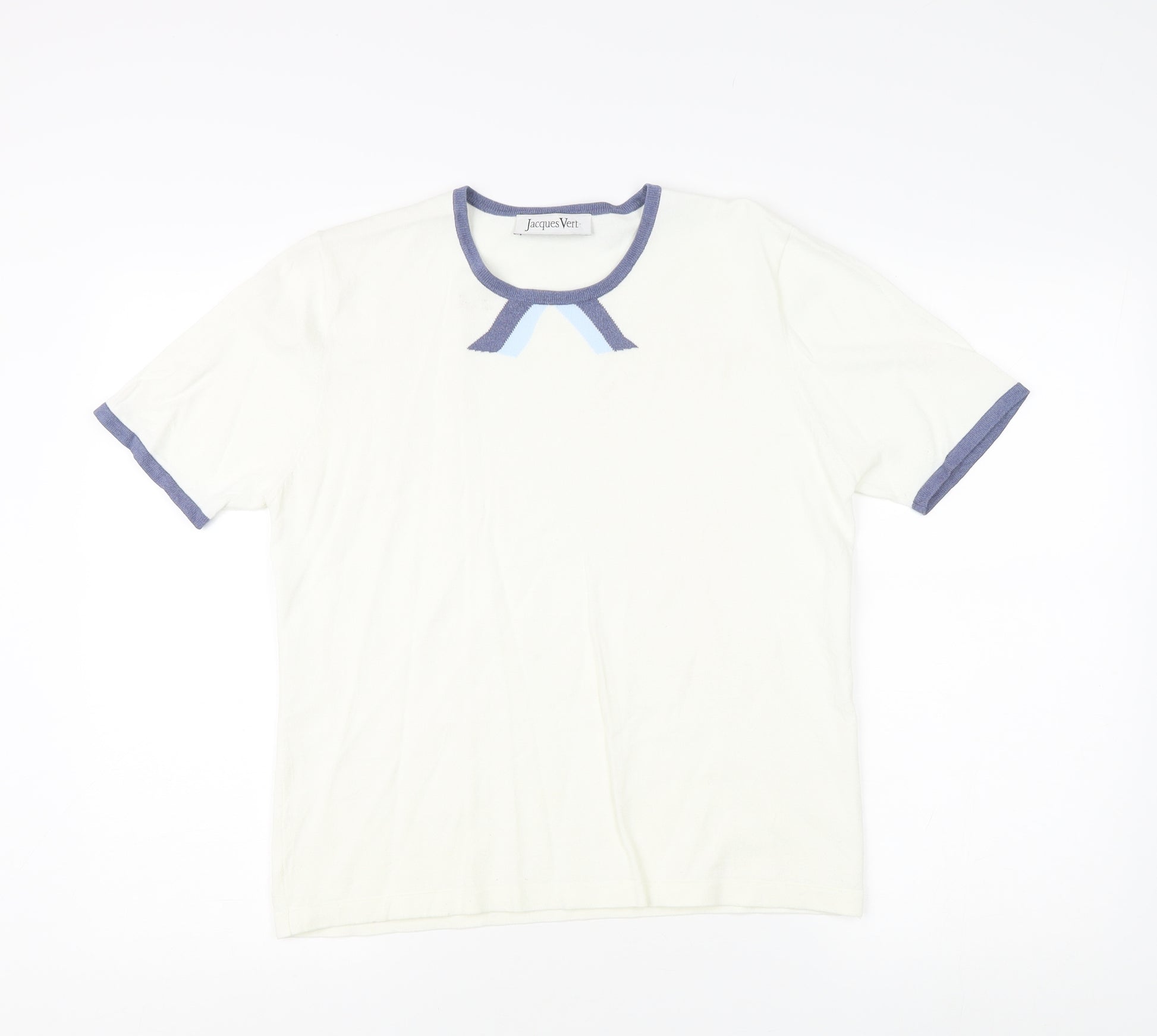 This stylish Jacques Vert T-Shirt, designed for women, showcases an elegant ivory hue with contrasting blue trim. Made entirely of soft, breathable cotton, this short-sleeved jersey shirt offers comfort and timeless style for everyday wear. The relaxed, regular fit makes it a versatile addition to any wardrobe, perfect for casual outings or relaxed gatherings. A classic crew neck adds to the garment’s refined simplicity, while the lack of overt patterns allows it to pair effortlessly with various bottoms and accessories. Whether you're going for a casual look or adding layers, this ringer-style T-shirt is suitable for all seasons. A pullover closure ensures ease of wear, and the minimal signs of use assure great condition. Enhance your wardrobe with this essential piece, an ideal choice for any fashion-forward individual seeking comfort combined with chic sophistication.