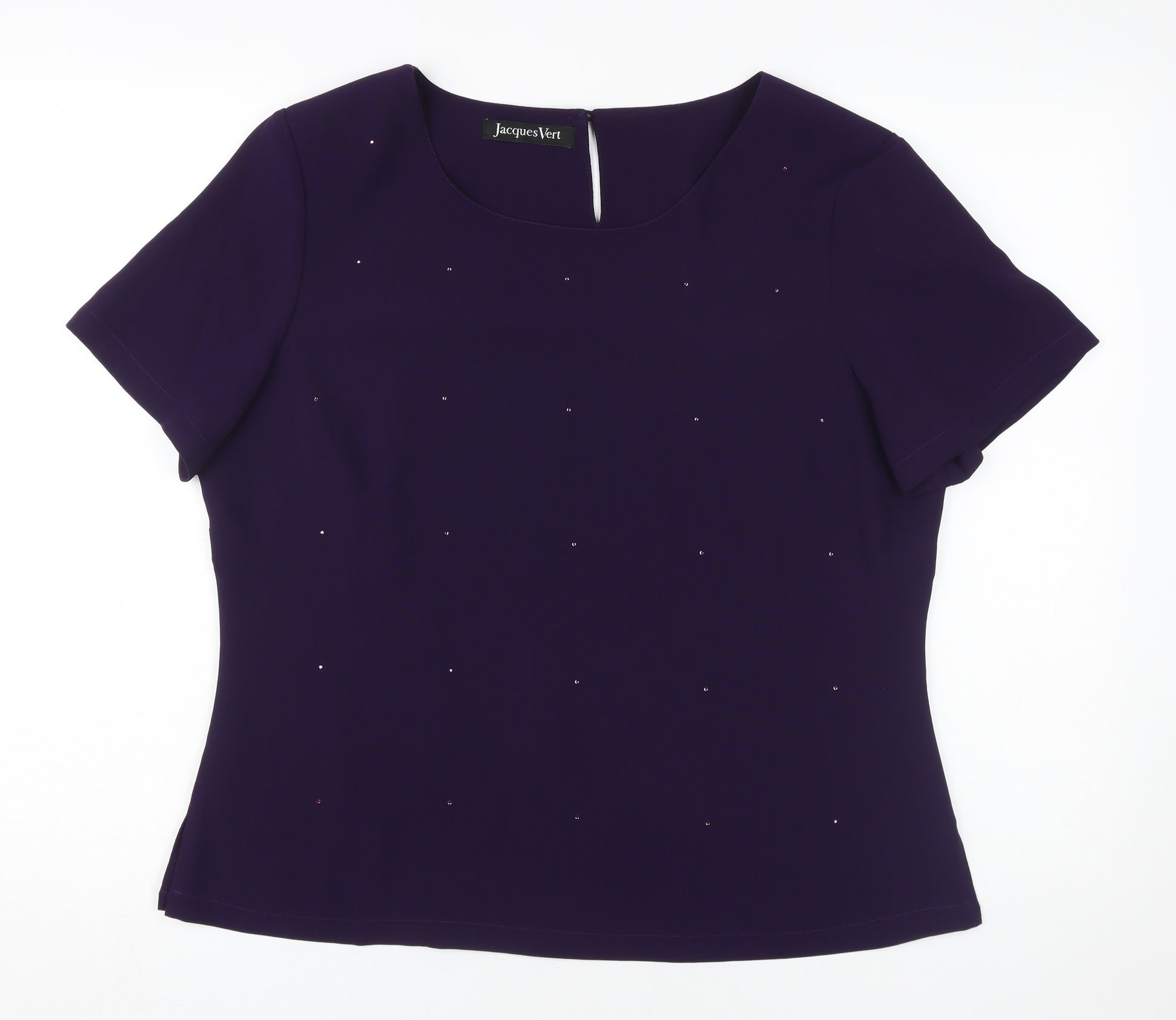 Elevate your wardrobe with this elegant Jacques Vert blouse, perfect for any discerning fashion enthusiast. Crafted in a regal shade of purple, this women's blouse is designed to offer a timeless look that is both versatile and sophisticated. Ideal for women seeking a classic and refined style, this short-sleeved blouse features a simple yet elegant round neckline, making it suitable for a variety of occasions, from casual outings to smart office wear.Made from high-quality polyester, this blouse offers the advantage of being easy care and machine washable, ensuring that maintaining its pristine appearance is effortless. The regular fit ensures comfort while providing a flattering silhouette, emphasizing a chic and polished appearance. Its classic/fitted sleeves add an extra touch of elegance, making it a perfect addition to any wardrobe.The blouse is expertly tailored to provide a seamless integration with any outfit choice, whether paired with tailored trousers for a professional ensemble or a skirt for a casual day out. Its solid pattern and simple design allow for effortless accessorizing, letting you shine while dressed in timeless fashion. With no visible damage and an excellent condition, this blouse represents a wonderful opportunity to infuse your wardrobe with a staple piece that speaks of quality and style.Whether for work, casual days, or social gatherings, this Jacques Vert blouse is a delightful garment that promises to make a statement wherever you go. Don't miss the chance to own a piece defined by its versatility and classic charm.