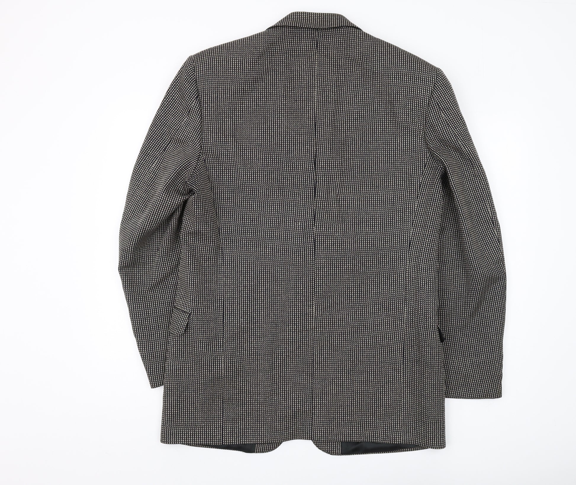 This Jaeger men's black check blazer is a timeless addition to any wardrobe. Crafted in Great Britain, the blazer features a sophisticated check pattern that exudes elegance and style. Made from a luxurious blend of 70% wool and 30% silk, it offers a classic fit, ensuring comfort and a polished appearance. Designed with a long jacket length, this single-breasted blazer boasts a two-button front and notch lapel style, making it the perfect choice for business settings or formal occasions. The double-vented back adds a touch of refinement, while the inner pockets provide practicality. Lined with 100% viscose/rayon for a smooth feel, this blazer is best suited for the autumn and winter seasons. Although in excellent condition, it shows signs of light use but retains its charm and functionality. Elevate your ensemble with this stylish Jaeger blazer, a must-have for any discerning gentleman.