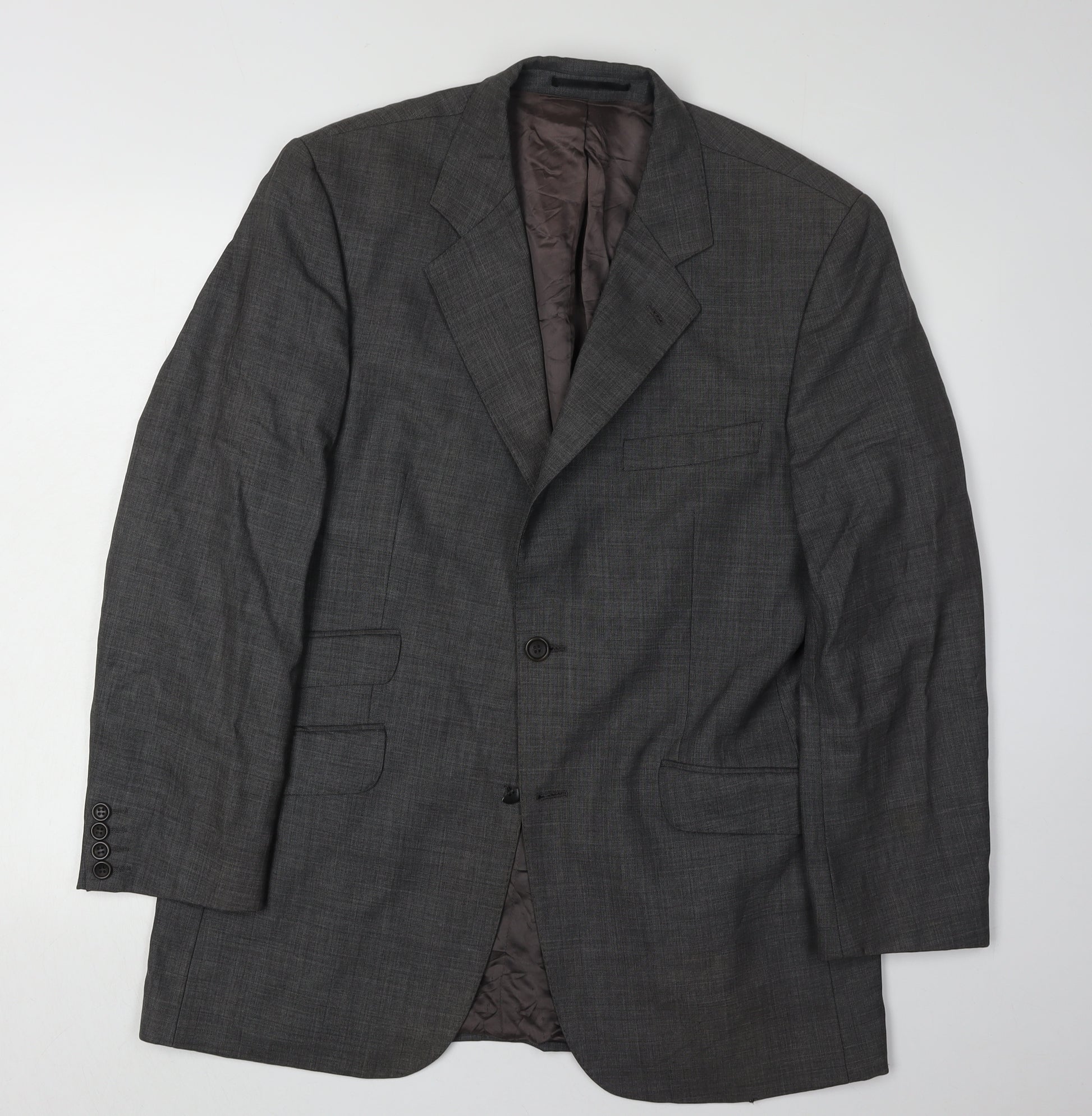 This exquisite Jaeger men's blazer offers an elegant and professional look for any occasion. Tailored to perfection in a size 40, it features a regular fit that complements most body types, ensuring comfort without compromising on style. The blazer is crafted from high-quality wool, providing both a luxurious feel and excellent durability. Its grey colour adds a versatile touch, able to pair seamlessly with various outfits, from business attire to smart-casual ensembles.Designed with a classic single-breasted cut, this blazer includes a two-button front, offering a timeless appeal. The notch lapel further accentuates the jacket's sophisticated silhouette, while the single-vented back enhances mobility. For added practicality, the jacket comes with multiple inner pockets, perfect for keeping essentials close at hand during meetings or social gatherings.The polyester lining of the blazer ensures a smooth fit over shirts or jumpers, adding to its comfort. Notably, it features four-button detailing at the sleeves, underscoring its attention to detail and refined finish. Ideal for both business and formal occasions, this blazer adapts effortlessly to an autumn or winter wardrobe, reflecting its versatile design.In excellent condition, with only slight creasing visible, this Jaeger blazer is a must-have investment piece that combines classic style with modern functionality. Dry clean only to maintain its immaculate appearance.