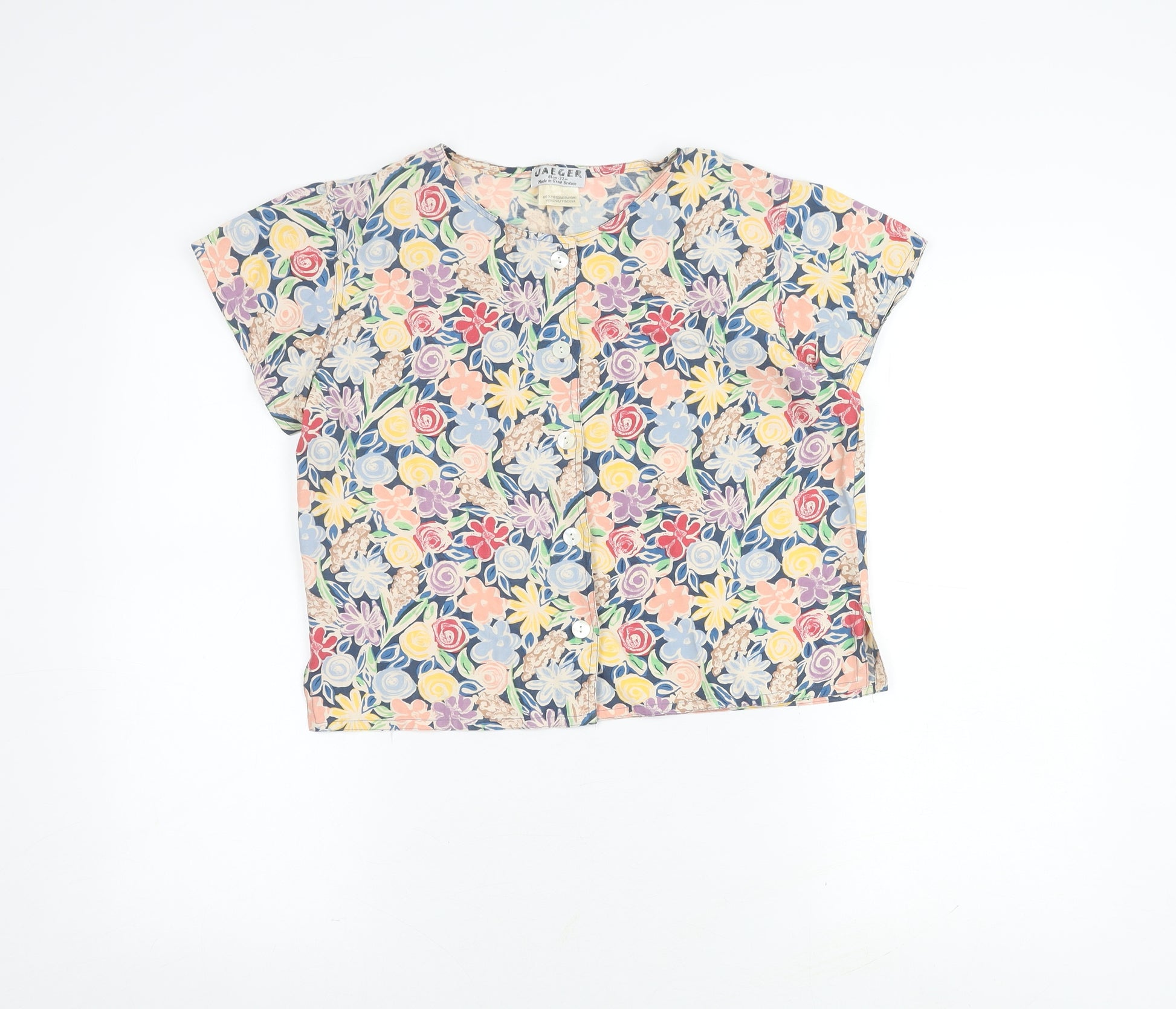 Elevate your wardrobe with this vibrant Jaeger multicoloured floral top, perfect for any fashion-forward individual. Crafted in Great Britain from 100% viscose, this lightweight and breezy piece offers comfort and style. The colourful floral pattern effortlessly captures attention, making it an ideal choice for casual outings or social gatherings. With cap sleeves and a button-up front, this top exudes a relaxed yet chic vibe, allowing for easy styling. Although it doesn't come with original tags, it's in excellent condition, ensuring you receive a quality piece. Pair this short sleeve top with your favourite jeans or a flowy skirt for a timeless look that can transition from day to night with ease. Priced affordably, it's a brilliant addition for those looking to enhance their spring or summer collection without breaking the bank.