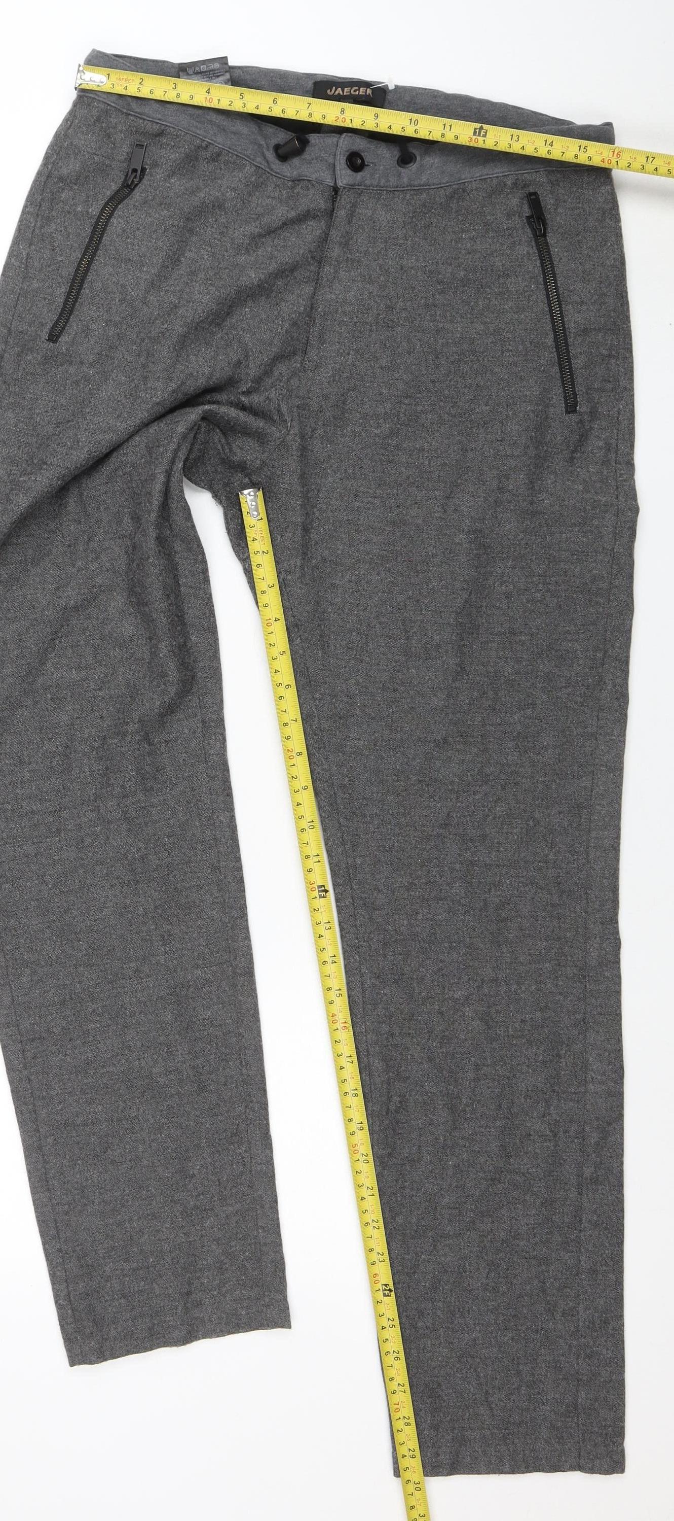 Elevate your wardrobe with these stunning Jaeger women’s trousers, crafted from a luxurious cotton and wool blend for the perfect balance of softness, warmth and structure. These classic grey trousers combine timeless tailoring with everyday comfort, making them ideal for both office wear and smart-casual occasions. The mid-rise fit ensures a flattering silhouette, while the straight leg offers a clean, elegant shape that transitions seamlessly from day to night. Functional front zip pockets add a contemporary touch and provide practicality for essentials, while the zip and button closure ensures a secure, polished finish. The premium twill fabric drapes beautifully, offering breathable comfort and a smooth texture against the skin. Perfect for the colder months, these trousers provide warmth without bulk, making them suitable for pairing with blazers, knitwear or crisp shirts. Designed by Jaeger, a name synonymous with enduring British quality and refined tailoring, they bring understated sophistication to any outfit. Great for business settings, casual lunches or relaxed evenings out, these trousers are versatile, stylish, and made to last. The material composition of 80% Cotton and 20% Wool provides softness and structure in equal measure, while the machine-washable care instructions ensure easy maintenance. In very good condition with minimal signs of wear, these Jaeger trousers are a superb addition for those who appreciate fine craftsmanship and timeless design. Choose these straight-leg wool blend trousers for a look that’s effortlessly elegant and distinctly Jaeger.
