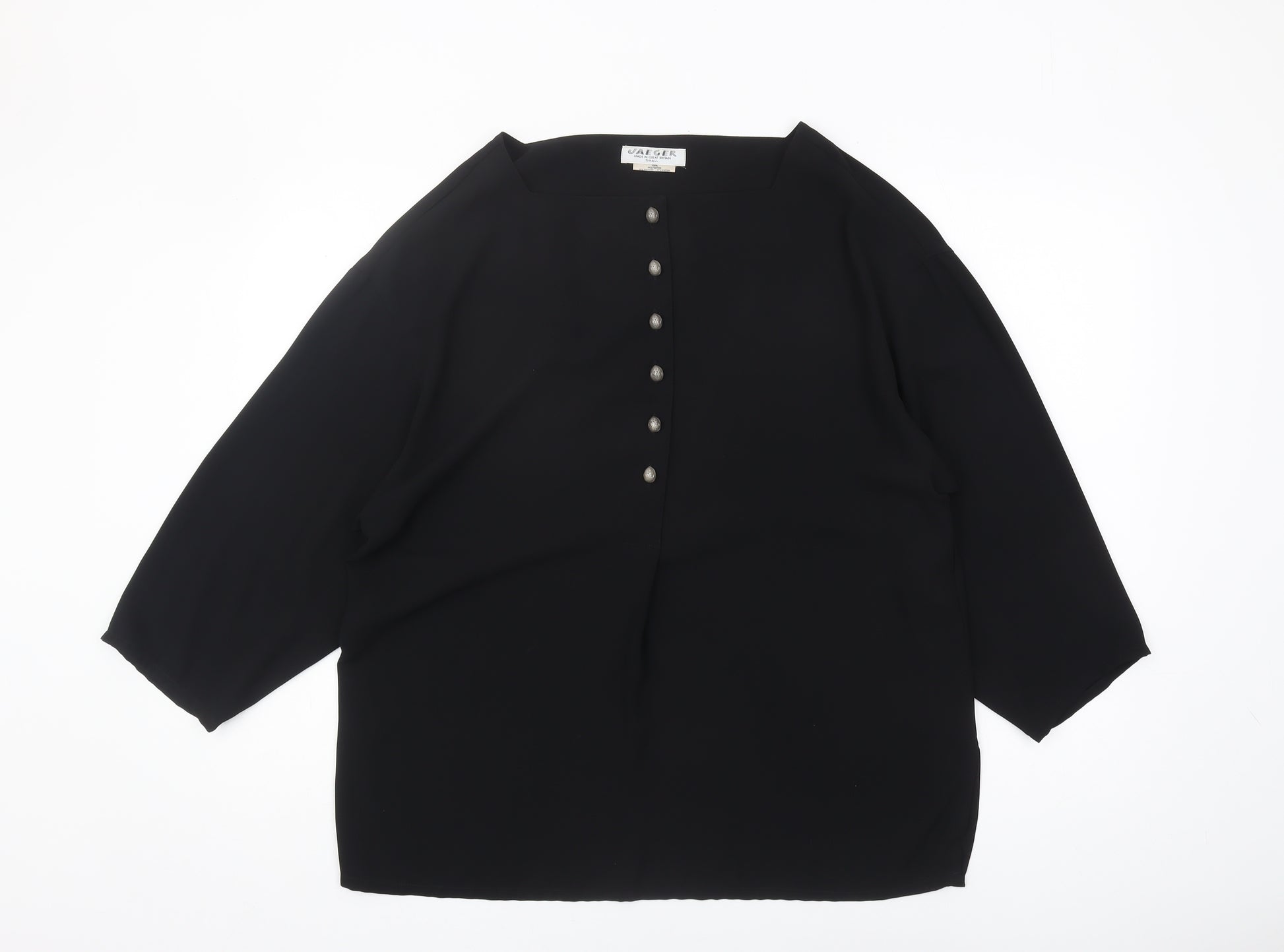 Elevate your wardrobe with this elegant black blouse from Jaeger, crafted in Great Britain. Designed for the modern woman, this blouse features a sophisticated boat neck and stylish 3/4 sleeves, making it a versatile piece for any occasion. Made from high-quality polyester, it's lightweight and comfortable, ideal for day-to-night wear. The button accents add a touch of detail while maintaining a sleek and solid appearance. Perfect for those who value both style and comfort, this regular-fit blouse is an excellent choice for casual or business settings. Its understated yet chic design ensures it will become a staple in your collection, pairing effortlessly with anything from tailored trousers to your favourite jeans. Whether you’re dressing up for a presentation or keeping it casual for a day out with friends, this blouse provides the ideal balance of elegance and function. Make this Jaeger blouse your go-to for a polished and sophisticated look.