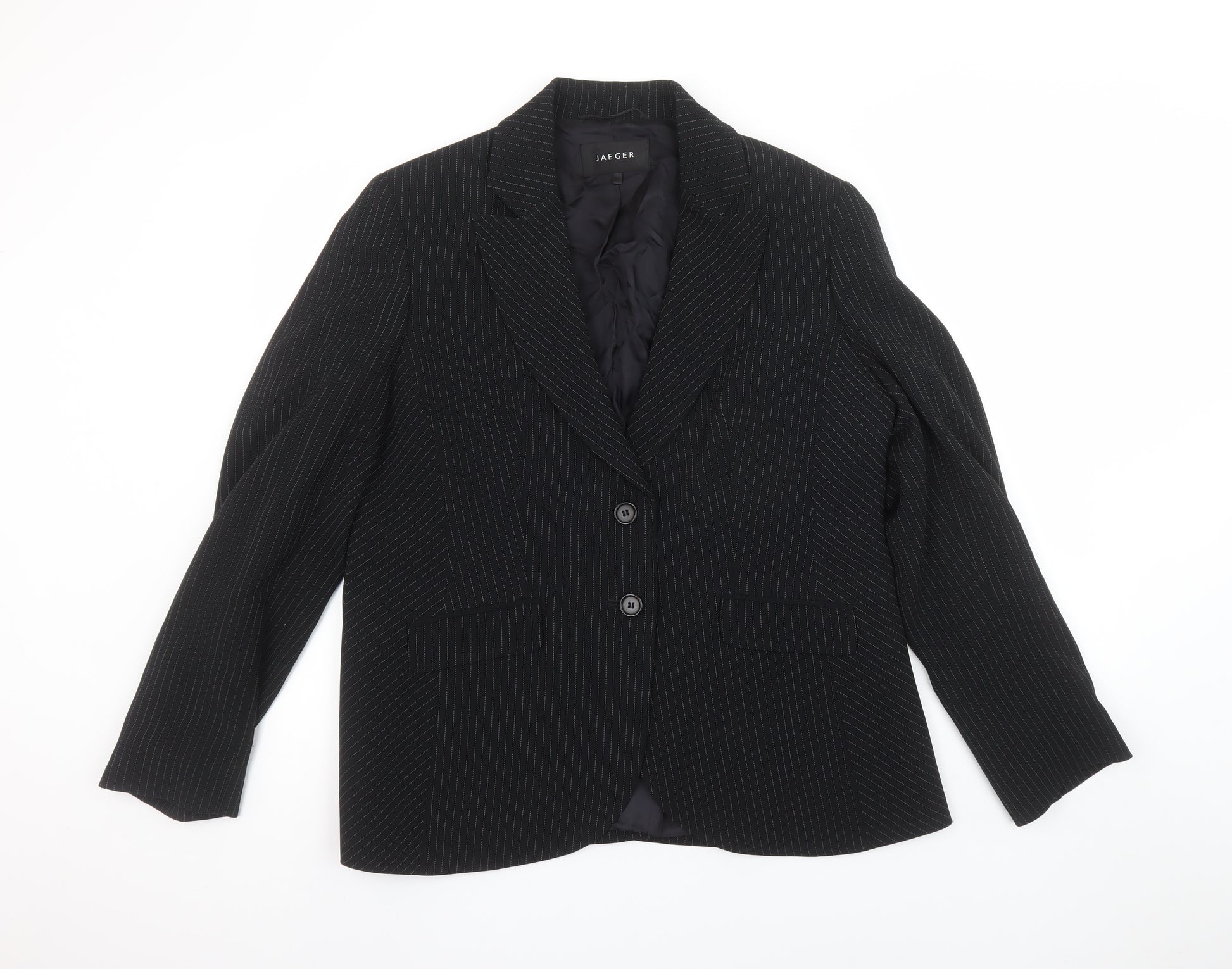 Elevate your professional wardrobe with this sophisticated Jaeger women’s black pinstripe blazer. Designed in a timeless single-breasted silhouette, this piece captures Jaeger’s renowned craftsmanship and refined tailoring. Cut in a classic fit, it features long sleeves, a structured shape, a notched lapel, and a two-button front fastening that subtly accentuates the waistline for a polished finish. The black fabric is adorned with delicate pinstripes, creating a sleek contrast that enhances the jacket’s modern yet professional aesthetic.Crafted from a premium blend of 70% triacetate, 29% polyester, and 1% cupro, the blazer boasts a durable yet smooth texture that drapes beautifully and maintains its structure. The fully lined interior, made from 100% viscose, ensures comfort and ease of movement throughout the day. This classic piece works perfectly as part of a tailored trouser suit or paired with smart separates for versatile styling options. The two front flap pockets and subtle shoulder shaping complete the premium look, while the high-quality tailoring encapsulates Jaeger’s commitment to sophistication.Ideal for business, formal, or workwear occasions, this blazer transitions seamlessly from office meetings to evening engagements. The piece’s timeless appeal makes it a valuable addition to any wardrobe. Suitable for autumn, spring, and winter seasons, it can be layered effortlessly over blouses or knitwear. The sleek black colour combined with the tailored pinstripe design ensures it remains an enduring wardrobe staple. In excellent pre-owned condition with only light signs of wear, this Jaeger blazer offers both elegance and lasting quality — a statement of refined taste and confidence every time you wear it.