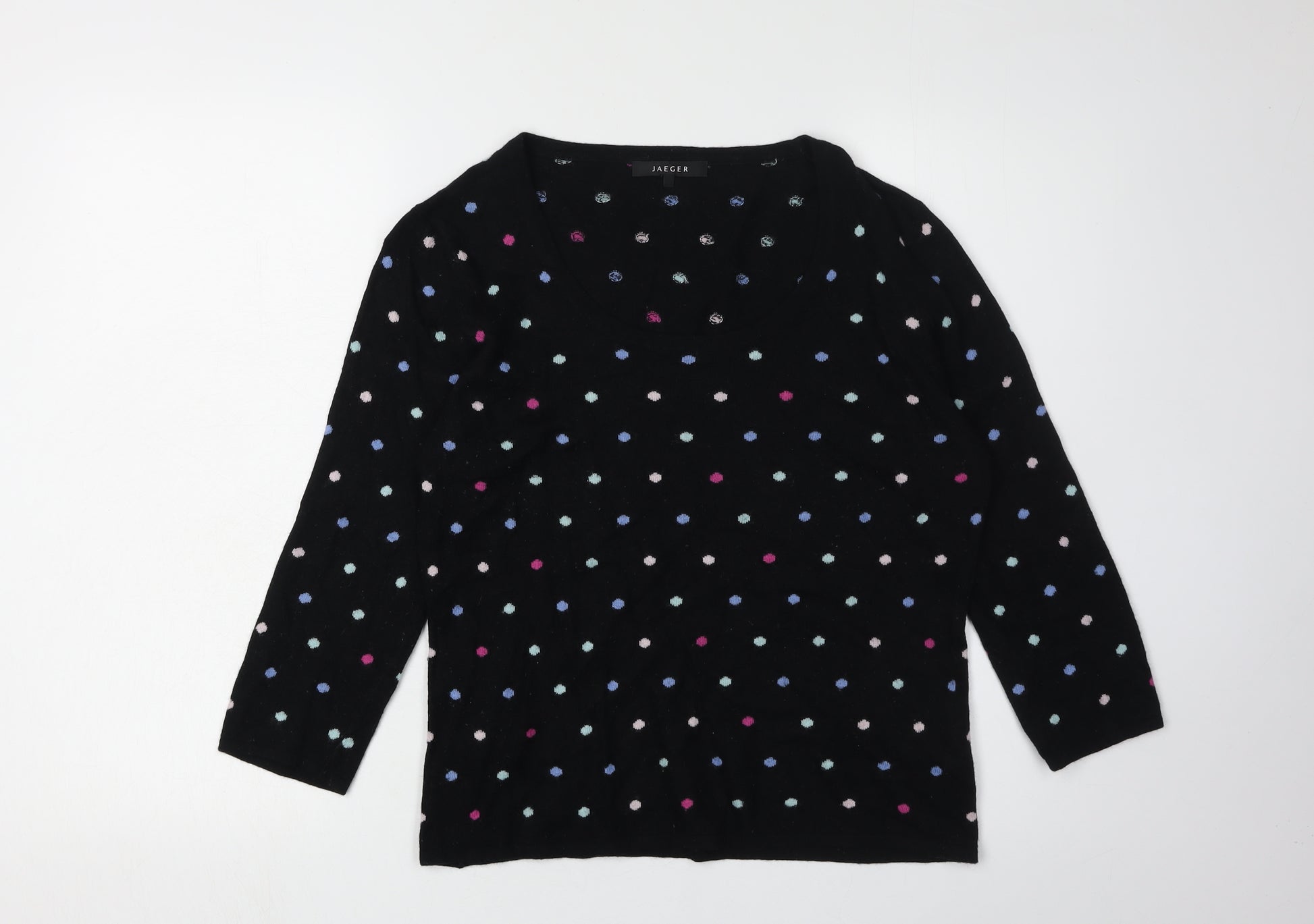 Elevate your chic style with this Jaeger Women's Black Polka Dot Pullover Jumper, a perfect addition to your casual wardrobe. Crafted from a luxurious blend of 70% wool and 30% cashmere, this knit jumper is tightly woven for a cosy yet fashionable look. The classic round neckline and 3/4 sleeves add a charming elegance, making it ideal for layering during the cooler autumn and winter months. The playful polka dot pattern, set against a sophisticated black backdrop, offers a whimsical touch to an otherwise timeless piece. Ideal for casual occasions, this jumper's medium size and regular fit ensure comfort without compromising on style. With a clean and tidy finish, this jumper is in excellent condition with no visible signs of wear. Dry clean only to maintain its premium quality and feel. Embrace the transitional elegance of this piece, designed to be a versatile staple in any fashion-forward woman's collection. Whether paired with jeans for a day out or dressed up with a skirt for a stylish evening, this jumper is sure to impress and provide endless wear year after year.
