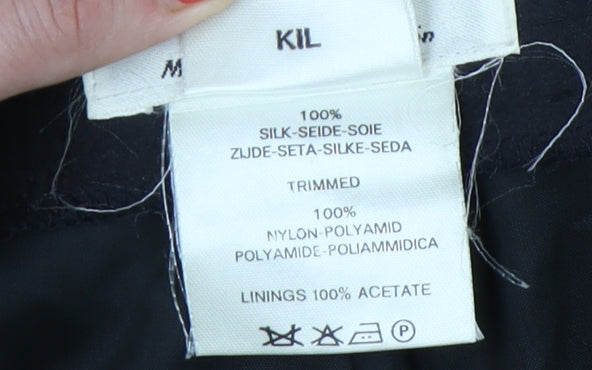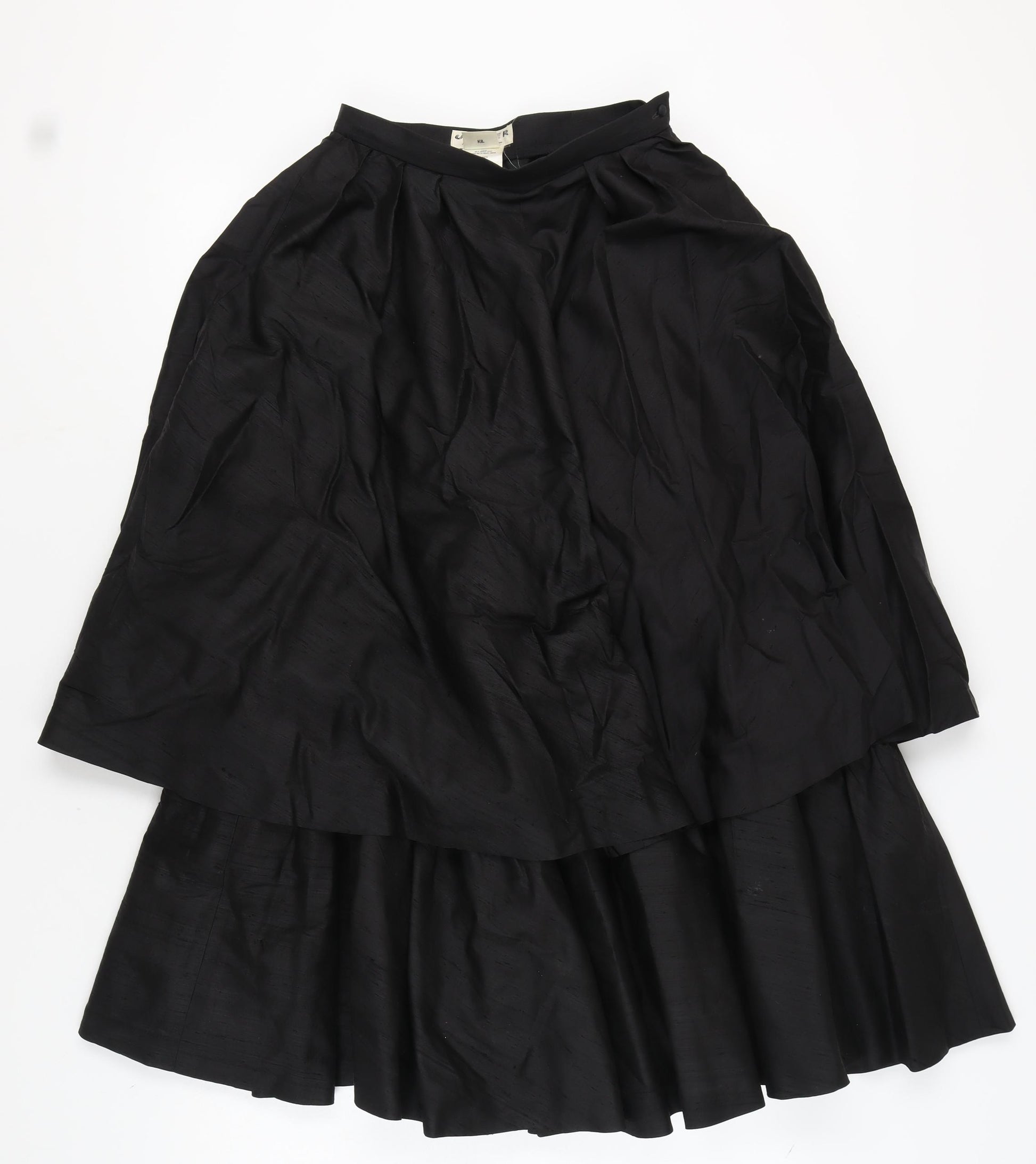 Elevate your wardrobe with this elegant Jaeger women's midi skirt, perfect for adding a touch of sophistication to any ensemble. Crafted from luxurious 100% silk, this A-line skirt presents a classic black hue, ensuring versatile styling options, from casual outings to formal events. The sumptuous texture of silk adds a hint of elegance, making it a worthy addition to your collection. Designed in the UK, this skirt embodies the refined British craftsmanship Jaeger is renowned for. Though this skirt is in excellent condition, slight wrinkles are visible, adding a touch of character without detracting from its appeal. It's suitable for regular size types, enhancing the silhouette delightfully. With its dry clean only feature, ensure this skirt maintains its exquisite look effortlessly. Dare to impress by pairing this sleek skirt with a tailored blouse for a polished office look or team it with a casual top for a chic weekend ensemble. Embrace timeless elegance with Jaeger's classic design that's sure to become a beloved wardrobe staple.