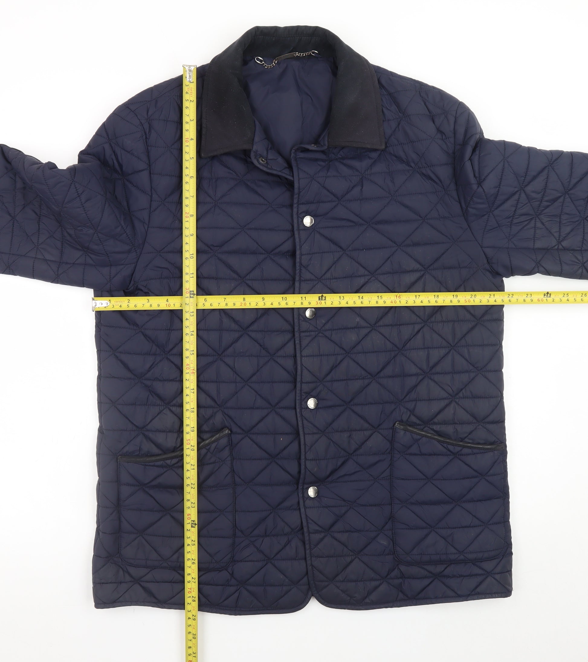 Stay effortlessly stylish and comfortable with this Jaeger women's quilted jacket in a timeless navy blue tone. Beautifully designed with classic diamond quilting, this elegant mid-length jacket offers both warmth and sophistication, perfect for autumn and winter transitions. Crafted from high-quality nylon, it is lightweight yet durable, ensuring you stay protected from the cold without compromising on ease of movement. The jacket features a soft polyester and nylon lining that adds an extra layer of comfort, while the suede-effect trim detailing around the collar and elbows creates a refined, polished finish. Designed with practical everyday wear in mind, this piece includes two spacious front pockets and secure snap button fastenings down the front, perfect for layering over jumpers, blouses or dresses. The collared style elevates a casual look into something smart enough for work, travel, or city strolls, while its regular fit flatters a wide range of body shapes. This versatile coat embodies Jaeger’s signature tailoring and attention to detail, making it an ideal choice for women who value quality and timeless style. Whether worn for a weekend countryside escape or a relaxed urban outing, it exudes understated British sophistication. In excellent pre-loved condition with minimal signs of wear, this jacket promises long-lasting wear and exceptional comfort. A true wardrobe staple, it represents the perfect blend of function, luxury, and everyday elegance that Jaeger is known for, making it a must-have outerwear piece for the cooler months ahead.
