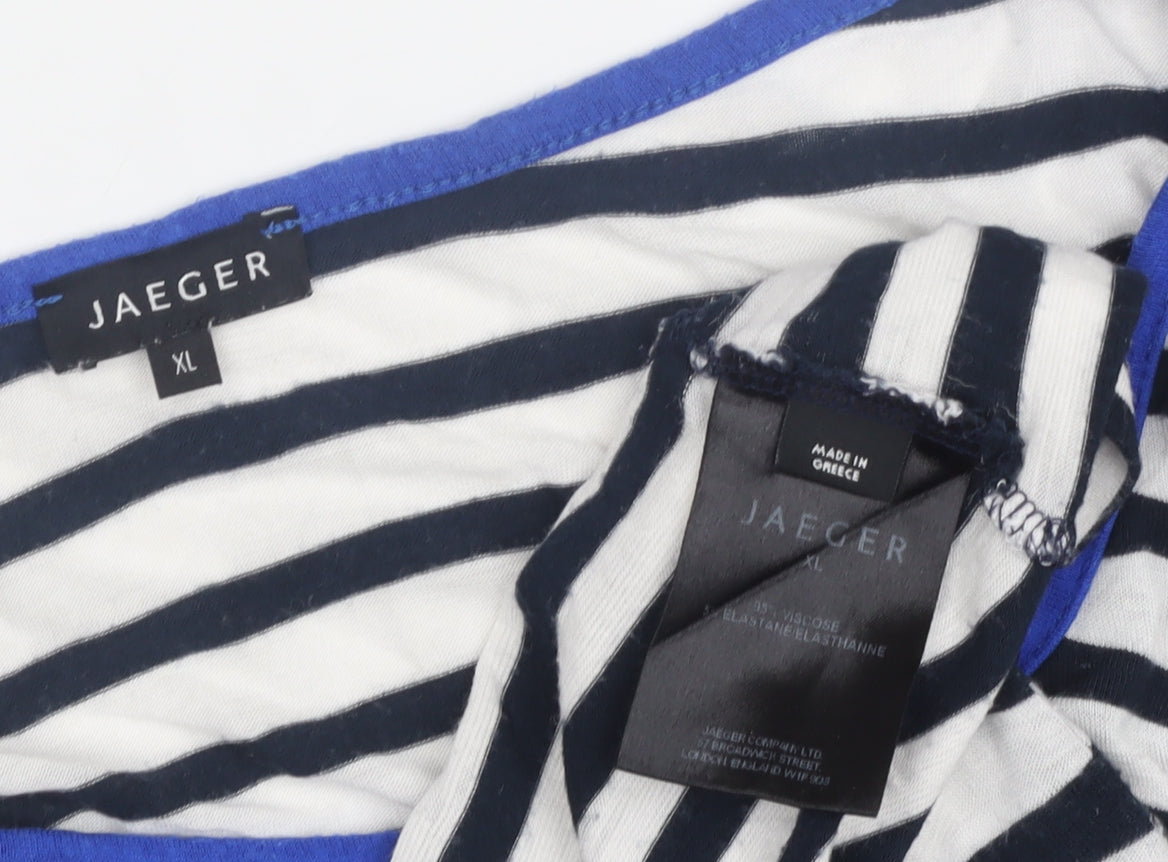 Upgrade your wardrobe with this chic women’s striped T-shirt from Jaeger. Designed in a versatile multicoloured stripe pattern, this top offers a trendy and casual look that's perfect for any occasion. Made from a comfortable blend of viscose and elastane, it ensures a relaxed fit and a flattering silhouette. The XL size makes it an ideal choice for all-day wear. Featuring a crew neckline with short sleeves, this T-shirt effortlessly combines style with functionality. Ideal for various casual occasions, it seamlessly integrates into any wardrobe. Whether paired with jeans for a relaxed outing or layered under a blazer for a more polished appearance, this striped T-shirt will be a staple piece. Embrace comfort and style with Jaeger’s timeless design.