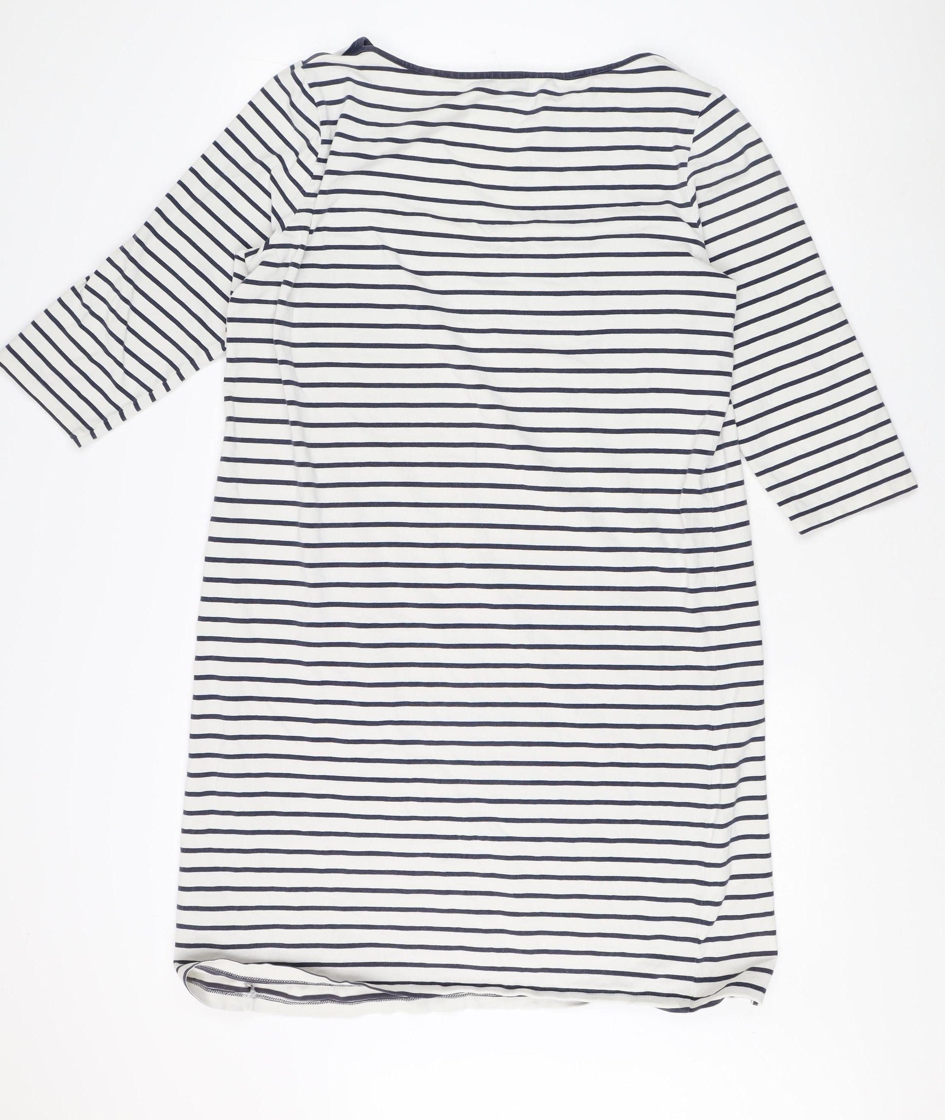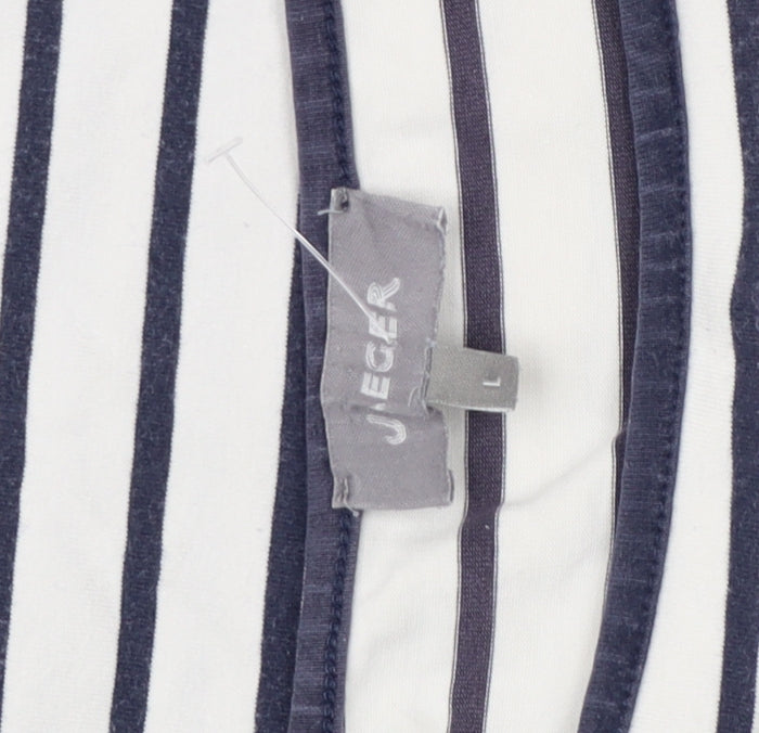 Discover timeless elegance with the Jaeger Women's Striped Boat Neck 3/4 Sleeve Dress. Crafted for the discerning modern woman, this dress combines comfort and style effortlessly. The striking multicoloured striped print exudes a classic aesthetic while the boat neckline gives it a sophisticated touch. Designed for casual occasions, the dress features a flattering 3/4 sleeve length, ideal for a refined look during the warmer spring and summer seasons. Made from a premium blend of cotton and elastane, the dress ensures a comfortable fit with a slight stretch that allows for ease of movement. Whether you're heading to a casual brunch or a leisurely stroll in the park, this versatile dress promises to keep you looking chic and comfortable all day long. Embrace a capsule wardrobe essential with this Jaeger dress, perfect for pairing with your favourite accessories and footwear for a completed look.