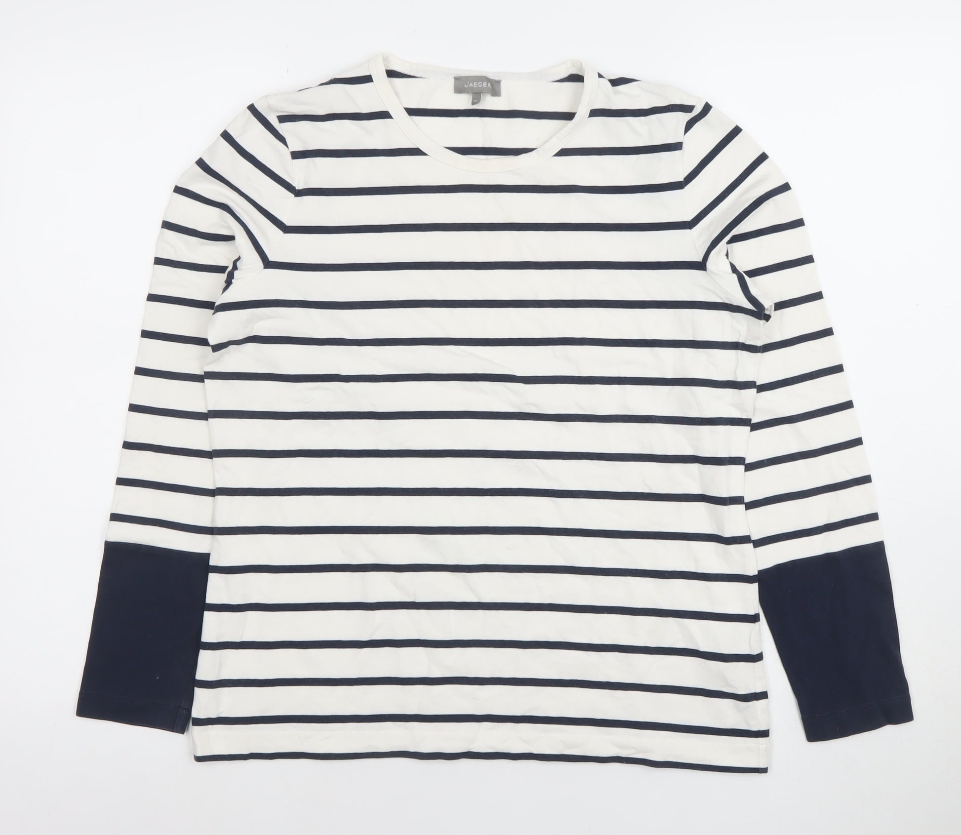 Add timeless nautical charm to your wardrobe with this beautifully made Jaeger women's long sleeve top. Crafted from a soft and comfortable cotton blend, this Jaeger piece blends casual elegance with effortless versatility. The white base is detailed with classic navy stripes and solid navy cuffs, making it a wardrobe staple perfect for year-round wear. Designed in a flattering regular fit, it offers just the right amount of stretch due to the elastane content, giving you unrestricted movement and a smooth, well-fitted silhouette. The crew neckline enhances its simplicity, while the premium jersey fabric ensures all-day comfort. Ideal for layering or wearing on its own, this top suits a variety of occasions — from relaxed weekends and travel to casual outings or smart-casual workwear. The breathable and easy-care nature of the cotton blend makes maintenance simple, keeping this piece fresh wear after wear. The long sleeves add a touch of warmth for transitional seasons, making it great for spring, cooler summer evenings, and autumn. Style it effortlessly with jeans, tailored trousers, or skirts for a chic yet laid-back look. Perfect for women who appreciate quality, understated design, and the refinement associated with the Jaeger brand, this striped long sleeve top captures a balance of simplicity and sophistication that never goes out of style. With its excellent condition, soft fabric, and nautical-inspired stripe pattern, this Jaeger top is a must-have addition to your collection — a true classic that pairs seamlessly with both casual and polished ensembles.