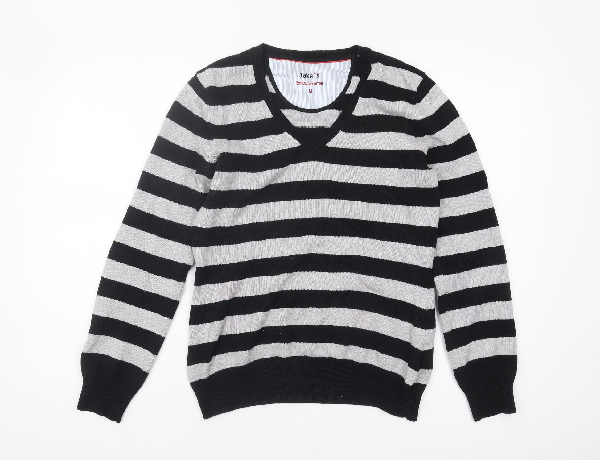 Experience the perfect blend of comfort and style with this men's V-neck pullover from Jake's. Made from extra-soft cotton, this jumper boasts a classic black and grey striped pattern that adds a touch of elegance to any wardrobe. Its regular fit and knit fabric ensure a comfortable wear that's perfect for casual outings or cozy winter days. The long sleeves and V-neck design provide a timeless look, easily paired with jeans or chinos for a versatile outfit. Ideal for autumn and winter, this pullover promises warmth without compromising style. With its excellent condition, this jumper is ready to become your go-to choice for effortless style.