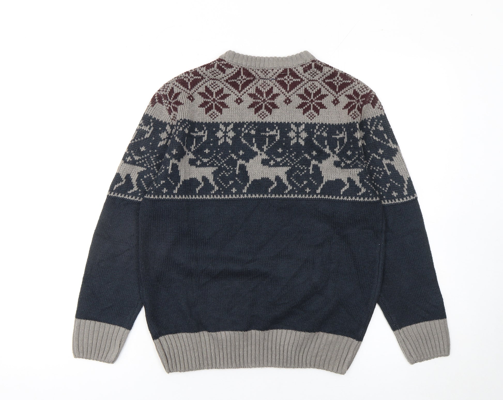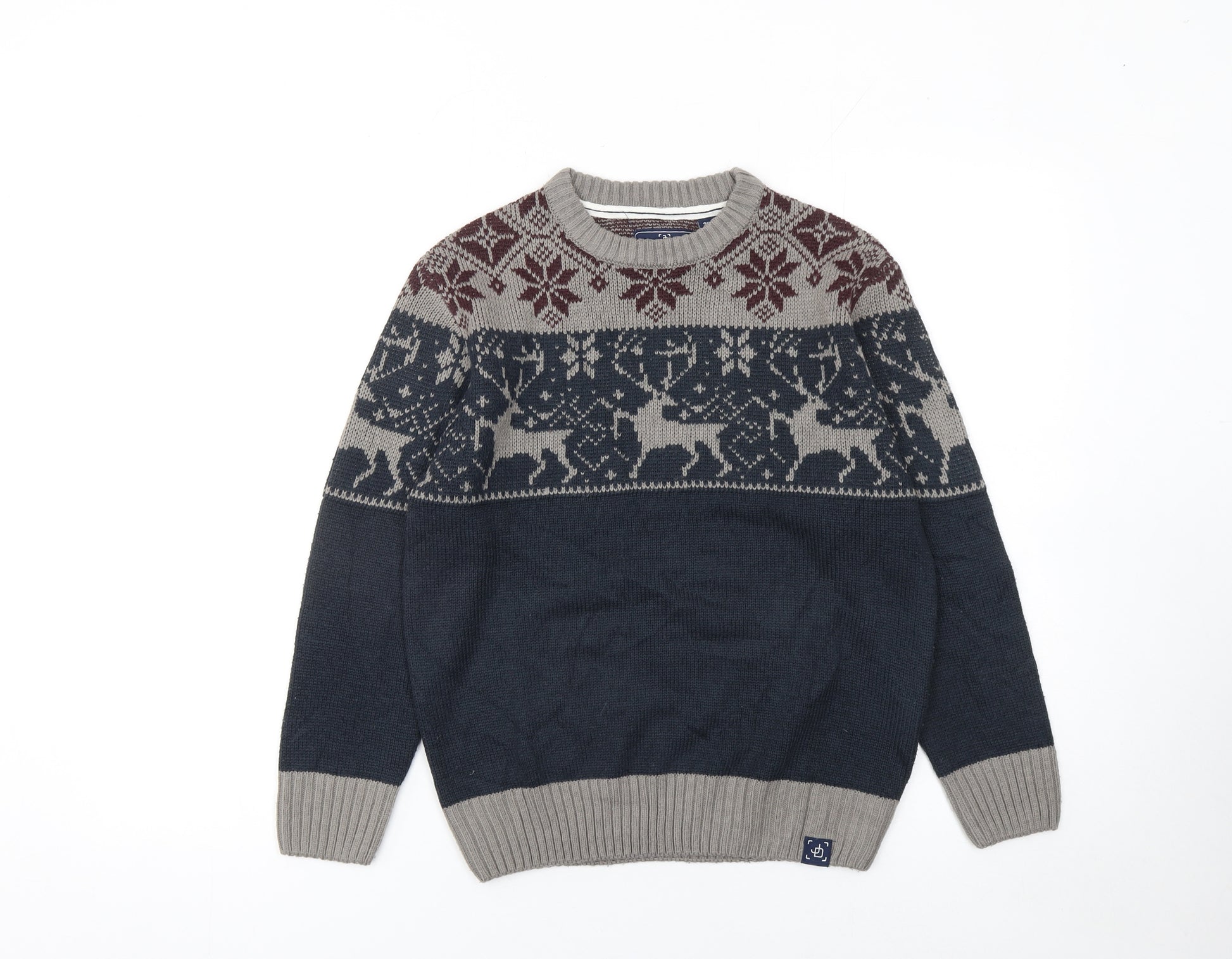 Boys Grey Navy Fair Isle Acrylic Crew Neck Jumper 9-10 Years