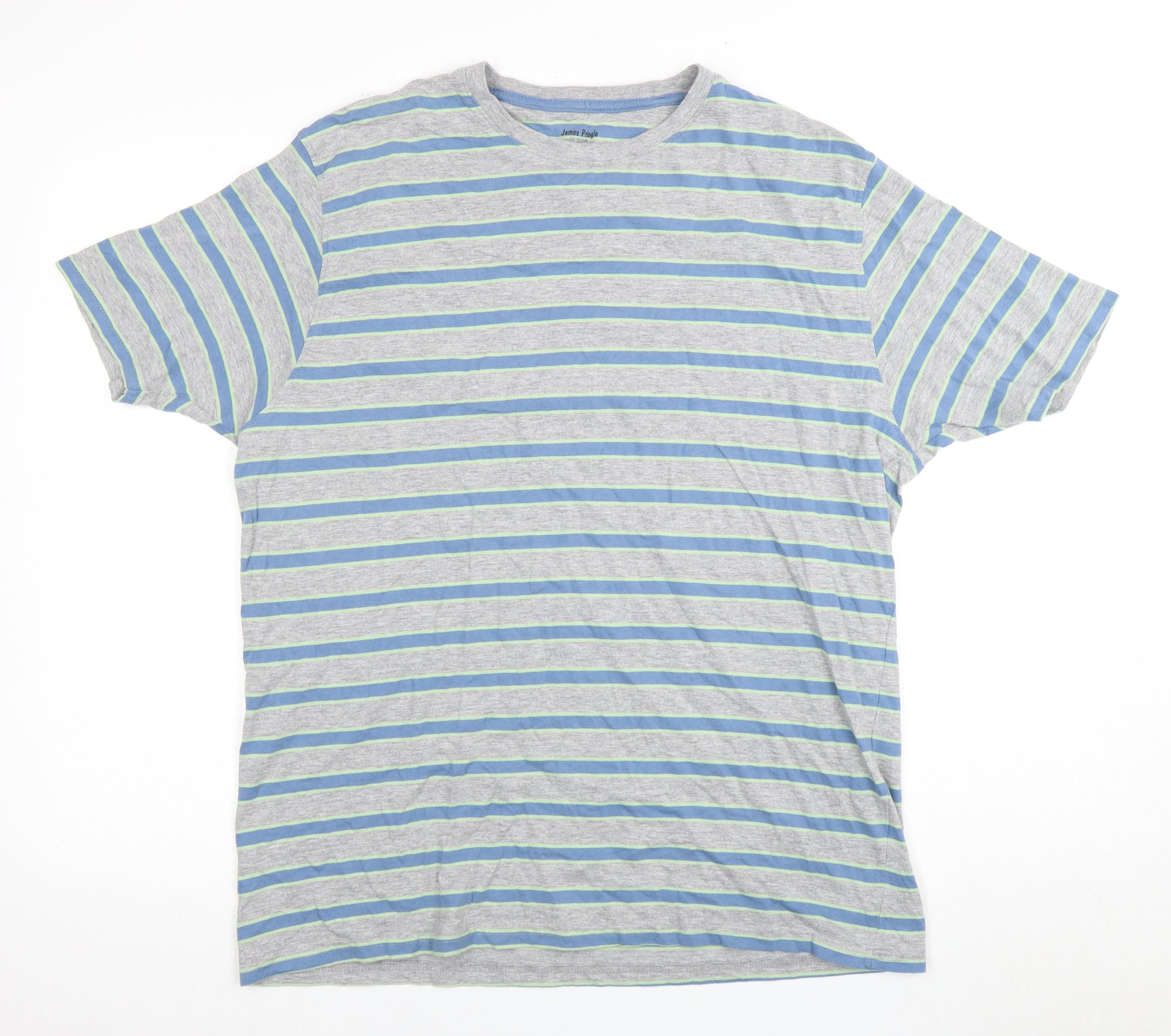 Upgrade your wardrobe with this stylish James Pringle T-shirt in size Large, perfect for men seeking comfort and versatility. Featuring a fashionable striped pattern in shades of grey and blue, this piece is an ideal go-to for casual outings and relaxed weekends. Crafted from a soft blend of 96% cotton and 4% viscose, this crew neck tee offers a regular fit, ensuring breathability and comfort throughout the day. With short sleeves for added ease, it serves as a versatile choice for all seasons. Designed as an everyday essential, this T-shirt is machine washable, promising effortless maintenance and long-lasting wear. Whether paired with jeans or shorts, its timeless design and high-quality fabric make it a must-have addition to any fashion-forward collection. Despite minor signs of wear, this T-shirt remains in excellent condition, making it an attractive option for those who appreciate great value. Let this classic and practical James Pringle T-shirt elevate your style effortlessly.