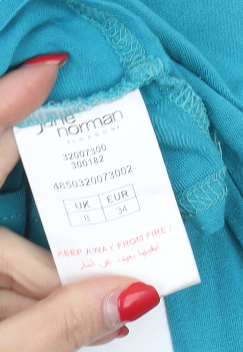 Embrace sleek style with this Jane Norman women's wrap blouse. Perfect for your spring and summer wardrobe, this blue long sleeve top features a flattering wrap design and a classic V-neckline that enhances its overall elegance. Crafted from a soft jersey fabric blend of viscose and elastane, it ensures comfort with a form-fitting slim fit. Despite slight wrinkles, this blouse remains in excellent condition, ready to complement your casual ensembles. Ideal for daytime outings or relaxed evenings, it pairs effortlessly with jeans or skirts, making it a versatile addition to your fashion collection.