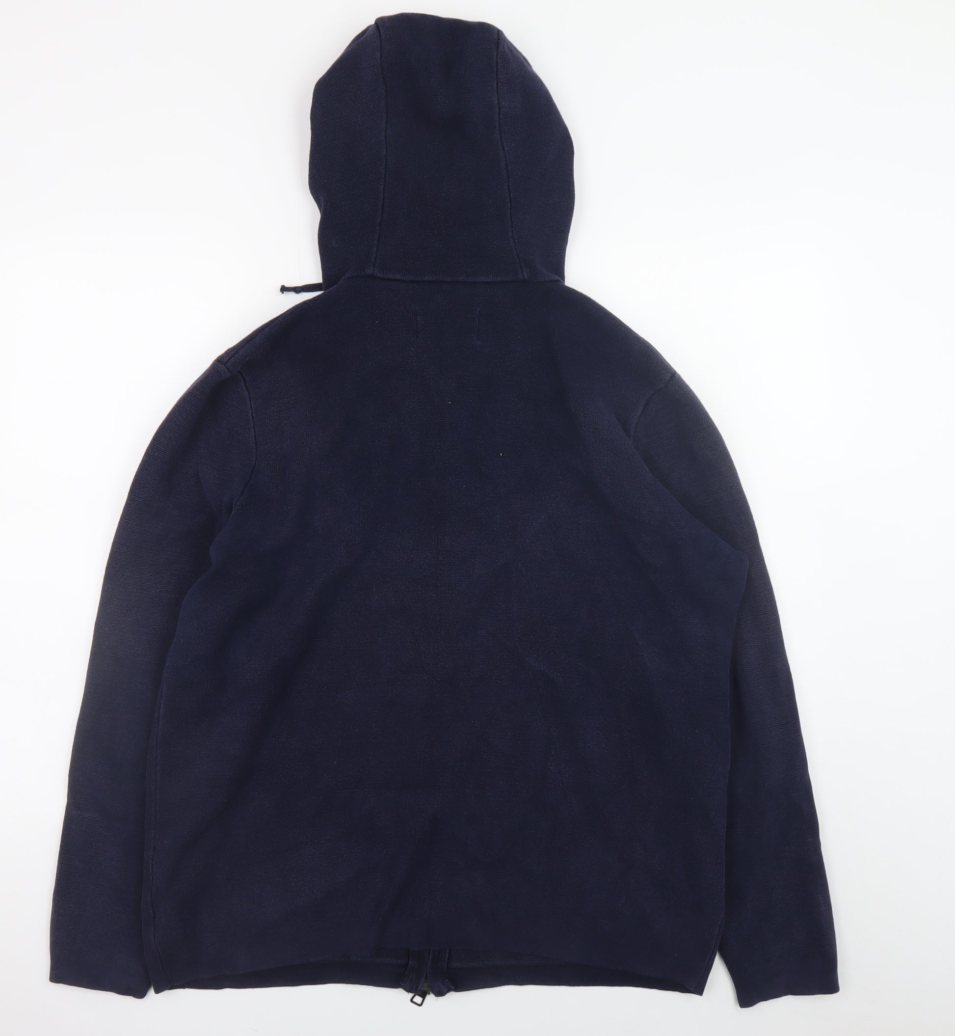This Jasper Conran men's blue hooded zip jacket offers a timeless blend of quality, comfort, and casual sophistication. Crafted entirely from soft 100% cotton, the fabric boasts a knit texture that provides breathability and warmth, making it an ideal companion for cooler autumn and winter days. The rich deep blue tone adds a versatile edge to your wardrobe, effortlessly pairing with jeans, chinos, or joggers for everyday wear. Designed with a convenient front full zip fastening, the jacket features a practical hood for extra protection from the elements and two large front pockets to keep your hands warm or store small essentials on the go. The mid-length cut and regular fit ensure a relaxed silhouette that feels comfortable and flattering for all body types. Its understated elegance and minimal branding reflect Jasper Conran’s signature British design aesthetic—smart, refined, and effortlessly wearable. Perfect for casual settings, travel, or leisurely walks, this jacket balances practicality with classic style. The interior is unlined, enhancing breathability while maintaining warmth through its cotton knit structure. This gently used piece remains in excellent condition with only light signs of wear, ensuring high quality and long-lasting appeal. For anyone seeking a durable, stylish outer layer that complements numerous outfits, this Jasper Conran jacket offers exceptional value. Easy to care for with machine-washable convenience, it suits men who appreciate effortless style without compromising comfort. A reliable choice for layering during transitional seasons, this hoodie-style jacket embodies the perfect mix of modern design and timeless versatility.