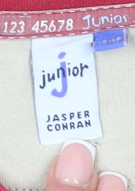 Introduce your little one to fashion fun with this delightful Jasper Conran T-Shirt, suitable for both boys and girls aged 12-18 months. Crafted from soft and breathable 100% cotton, this T-shirt ensures maximum comfort and durability for everyday adventures. Boasting an adorable graphic print featuring trains, it captures the imagination with vibrant design and playful charm. Its versatile red and beige colour palette effortlessly complements any ensemble, making it a practical yet stylish choice for your child’s wardrobe.Featuring a crew neck and long sleeves, this T-shirt provides an extra layer of warmth, perfect for all-season wear. Its pullover design allows for easy dressing while maintaining a snug, secure fit throughout the day. The embroidered accents add a touch of texture and interest, captivating young eyes with intricate details that enhance the overall aesthetic.Ideal for casual occasions, this top is a wardrobe essential for any young explorer. The unisex design ensures a universal appeal, making it a wonderful gift option for birthdays or other special celebrations. With hassle-free machine washability, it retains its vibrant colours and softness wash after wash. Although in excellent condition, it lacks original tags but shows no signs of wear, ensuring a reliable and stylish addition for growing closets.Make this charming Jasper Conran T-Shirt part of your child’s everyday adventures, blending comfort, style, and quality in one adorable package. Snap up this wardrobe gem at an unbeatable price, guaranteeing smiles and endless compliments with every wear.