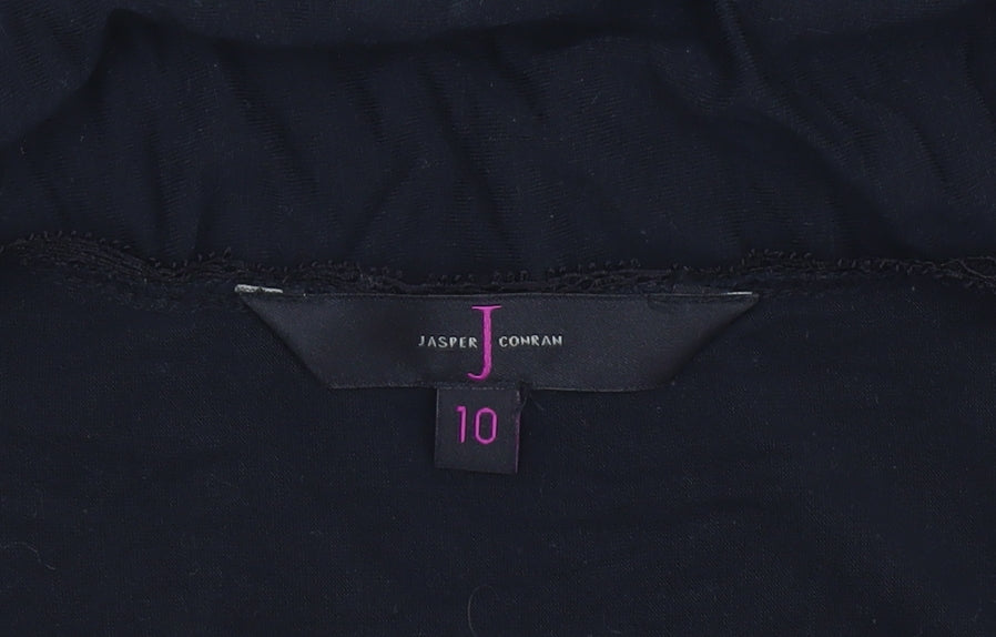 This elegant Jasper Conran women’s blouse is a perfect addition to any stylish wardrobe. Designed in sleek black, the blouse features a beautiful floral print around the hem and cuffs, offering a subtle yet eye-catching contrast. The soft jersey fabric provides a light and comfortable fit, made from a blend of viscose and elastane that allows a gentle stretch for everyday wear. Its long sleeves and scoop neckline, accentuated by a small bow and button detail, bring a feminine and polished touch suitable for both casual and semi-formal occasions. Crafted for comfort and elegance, this top has a regular fit that flatters the silhouette without feeling restrictive. The lightweight nature of the fabric, alongside its breathable and stretchy composition, makes it versatile for layering during cooler months or wearing on its own in spring and autumn. The pullover design ensures ease of wear, while the signature Jasper Conran touch gives it a refined, timeless look. Perfect for pairing with jeans, skirts, or tailored trousers, this tunic blouse transitions effortlessly from day to evening. Its intricate floral accents deliver just the right amount of personality without overwhelming the simplicity of the black base. The overall condition is excellent, showing only light signs of gentle previous use and no visible flaws. Suitable for modern women who appreciate quality, this blouse captures both comfort and class in one effortless piece. Whether styled for a lunch date or smart-casual work setting, it embodies understated sophistication — a hallmark of Jasper Conran design. This piece promises to become a go-to favourite for those seeking refined style blended with everyday ease.