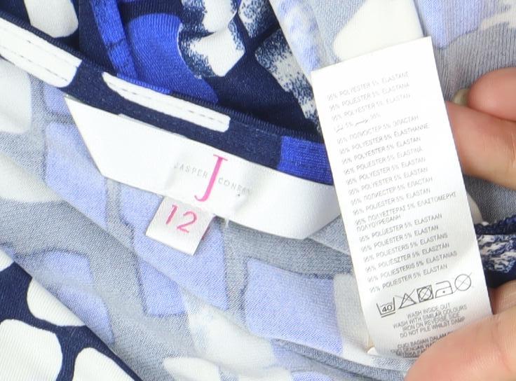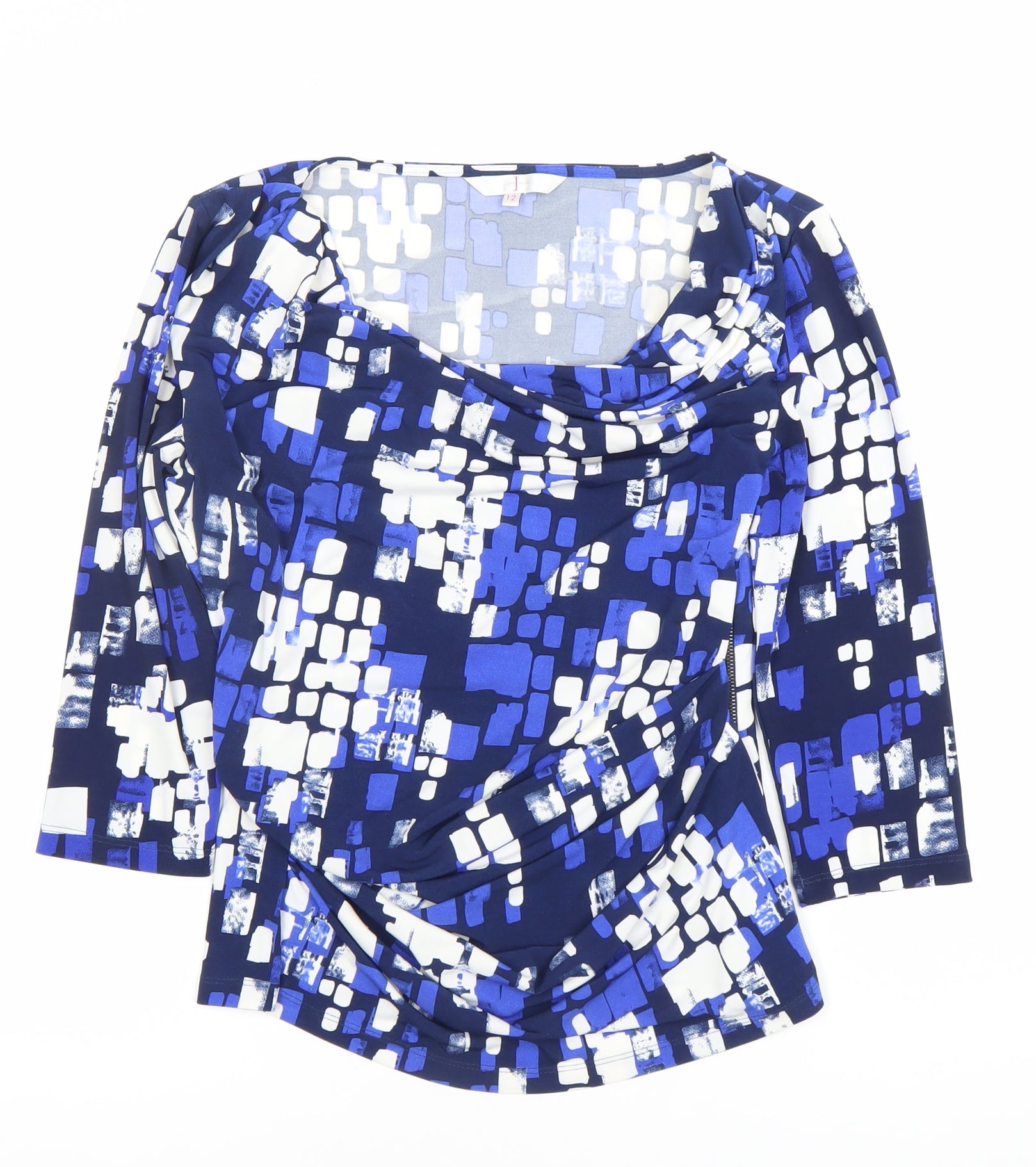 Elevate your wardrobe with this stylish Jasper Conran women's blouse, perfect for adding a pop of colour and sophistication to your everyday looks. Designed in a flattering and versatile cowl neck style, this blouse features a vibrant blue geometric print, accented with contrasting white and blue hues that bring a modern edge to your outfit. Crafted from a quality jersey fabric blend of 95% polyester and 5% elastane, it offers stretch for ultimate comfort while keeping its shape beautifully. With its 3/4 fitted sleeves, this top is suitable for wear across all seasons, making it a go-to piece whether paired with tailored trousers for the office or jeans for a casual weekend look. The classic fit ensures it drapes well, while the pullover design makes it easy to wear. The smooth and breathable fabric makes it perfect for day-to-night transitions, ensuring you stay stylish and comfortable throughout the day.This Jasper Conran blouse boasts a timeless and versatile design that works for casual occasions, offering effortless elegance without compromising on comfort. The striking geometric pattern adds a trendy touch while keeping the look sophisticated, enabling you to style it up or down as needed.Machine washable for easy care, this blouse is practical and hassle-free to maintain. Presented in excellent pre-owned condition with no visible flaws or damage, this is a high-quality garment at a fantastic price point compared to buying new.If you need a versatile and stylish addition to your wardrobe that blends comfort, style, and sophistication, this piece is a perfect choice. Jasper Conran is known for its quality craftsmanship and attention to detail, and this blouse is no exception – a true essential that can be worn again and again.