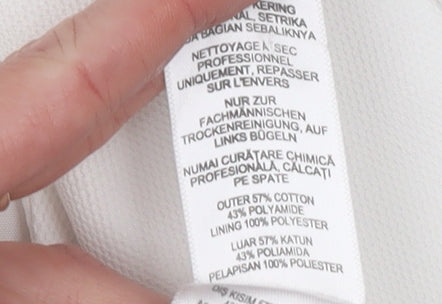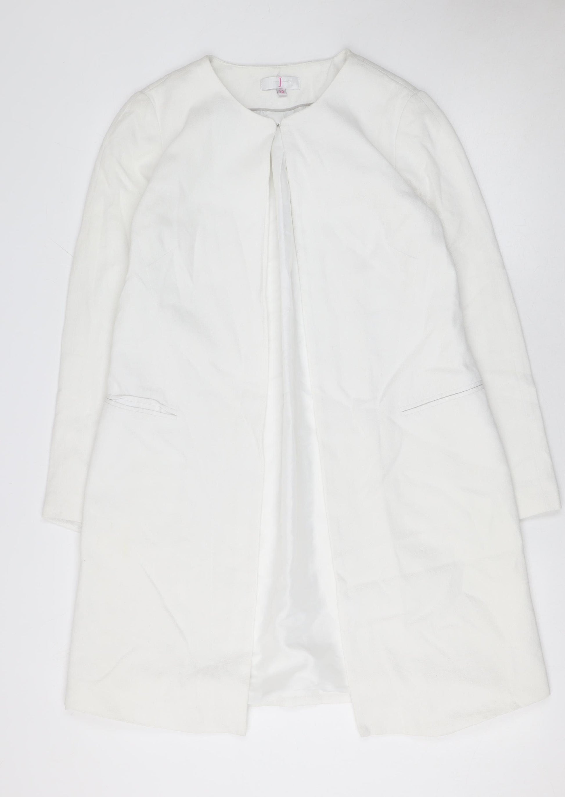 Step out in effortless sophistication with this elegant white long coat from Jasper Conran, designed exclusively for women seeking classic style with modern refinement. Exquisitely tailored to a regular fit, this minimalist overcoat drapes beautifully for a polished and feminine silhouette that remains timeless through the seasons. Crafted with a premium blend of cotton and polyamide, it delivers a smooth, structured appearance and a lightweight yet durable feel. Its composition of 57% cotton and 43% polyamide ensures breathability and softness, while the fully lined polyester interior adds comfort and refinement. The crisp white colour enhances its sophistication, making it an ideal piece for formal occasions, business events, or elegant evenings, yet effortless enough for everyday wear. The open front design gives a graceful flow, paired with discreet pockets for practicality without sacrificing style. Thoughtfully crafted with a smooth twill texture and a clean, collarless neckline, this Jasper Conran coat infuses simplicity with luxury. Perfect for spring and autumn, it layers beautifully over dresses, suits, or smart-casual ensembles. Whether dressing for a workplace meeting, a garden party, or a sophisticated soirée, this coat transitions seamlessly from day to evening. The garment has been professionally cared for and remains in very good condition, with a faint mark near the lower front, barely detracting from its appeal. Invest in timeless elegance and versatility with this stunning Jasper Conran women's long coat — a wardrobe essential that complements every refined collection. Its chic silhouette, premium fabric blend, and understated charm make it a quintessential choice for the modern woman who values style and simplicity alike.