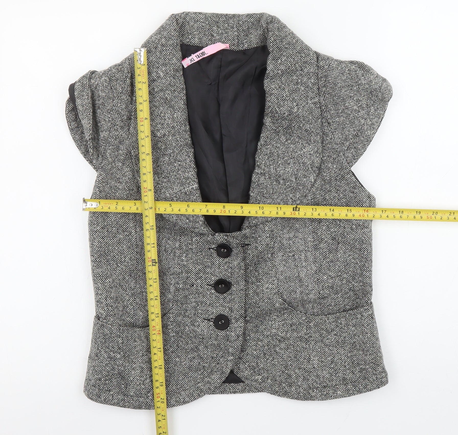 Elevate your wardrobe with this chic JCL Trends women's suit waistcoat in a timeless grey tweed style. Beautifully tailored, this sleeveless piece features a flattering shawl collar and a three-button single-breasted front closure, adding sophistication to its refined silhouette. The waistcoat’s fabric blend of 50% polyester, 42% acrylic, and 8% other fibres creates a durable and comfortable texture, perfect for professional or smart-casual outfits. Fully lined in 100% polyester, it offers a smooth interior finish that enhances comfort and durability for extended wear. With its fitted cut and subtle herringbone pattern, the design balances classic tailoring with a modern flair. A charming bow detail at the back adds a feminine touch, while the tailored fit flatters the figure and lends structure to your look. Ideal for autumn and winter wear, this piece pairs effortlessly with a crisp blouse, trousers, or a pencil skirt for stylish work or evening ensembles. Suitable for business meetings, office wear, or casual outings that call for polished sophistication, this JCL Trends waistcoat is a versatile addition to any wardrobe. In excellent pre-owned condition with no visible flaws, it shows only minimal signs of gentle use. Add this elegant garment to your collection for a touch of class and confidence. A perfect choice for those who appreciate refined tailoring and timeless design without compromising on comfort or quality. Available now in size M, corresponding to a comfortable UK 12 fit, this waistcoat promises enduring style across seasons at an affordable price.