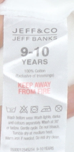 This delightful Jeff Banks girls’ white camisole top blends timeless charm with effortless comfort, making it a perfect addition to any young fashionista’s wardrobe. Designed in a crisp white hue, the top is crafted from 100% cotton, ensuring a soft, breathable feel ideal for warmer days. Its design features beautifully detailed ruffle straps made from broderie-style cotton, adding a feminine touch that’s both classic and playful. The square neckline lends a contemporary flair, while the lightweight, woven fabric gives the garment a casual air that makes it easy to wear for all-day comfort.Cut in a regular fit, this Jeff Banks top is perfect for ages 9-10 years and provides excellent breathability. The pullover closure ensures easy dressing, while the elasticated back section offers a comfortable and flexible fit. Perfect for spring and summer wear, this versatile piece can be easily paired with denim shorts, skirts, or layered under lightweight cardigans for cooler days. With its subtle charm and high-quality craftsmanship, it maintains the refined styling synonymous with Jeff Banks.This piece has been carefully inspected and is in excellent pre-loved condition, showing no visible marks or flaws. It does not include the original sales tags but remains fresh, clean, and ready to wear. Retailing for a fraction of new price points for similar designer tops, this piece offers both quality and value.Ideal for casual days out, family gatherings, or summer events, this girls’ ruffled cotton camisole top highlights simplicity, comfort, and signature detailing. It’s a stylish pick that balances everyday practicality with a soft, pretty look—an easy choice for parents seeking style, comfort, and durability for their child’s wardrobe.