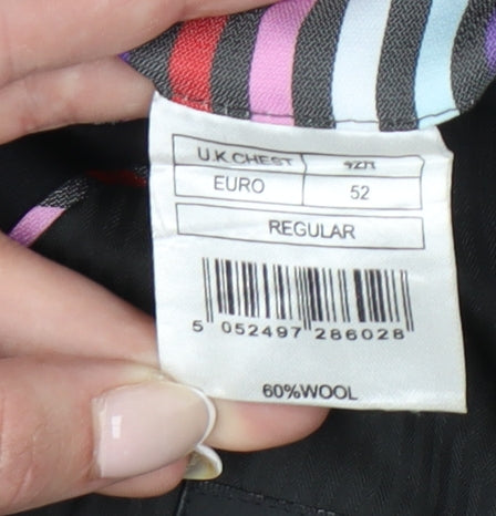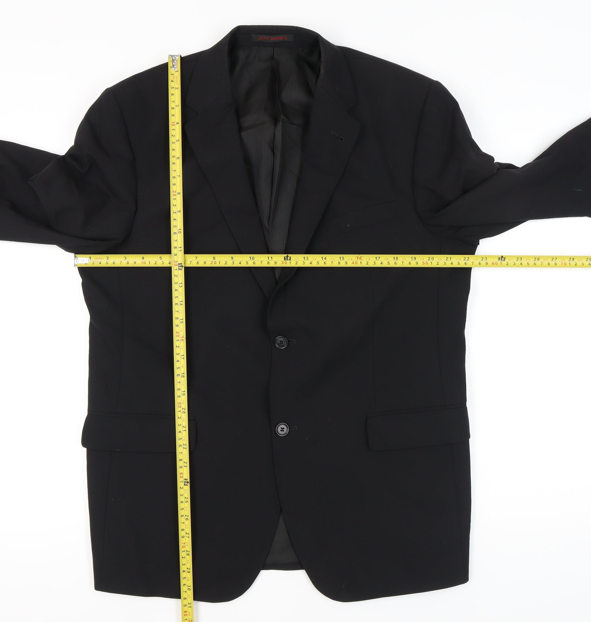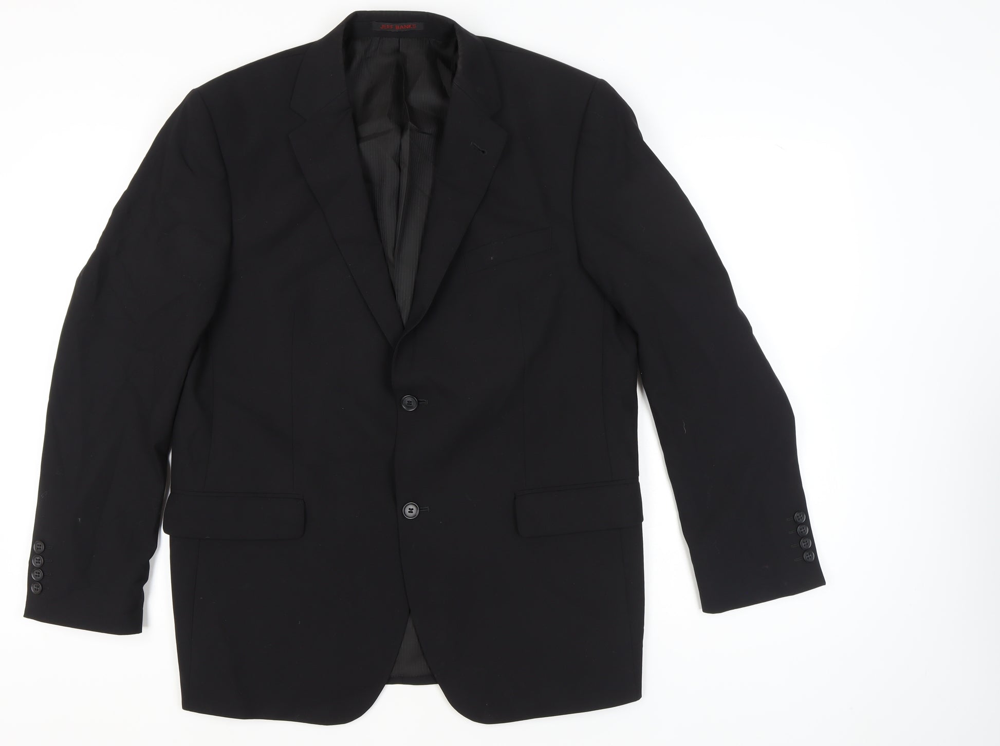 This Jeff Banks London men’s blazer from the Travel Plus collection is a stylish and versatile wardrobe essential, perfect for smart and professional occasions. Designed in a classic black shade, it offers a timeless look that will suit both business and formal events, making it a versatile piece for any gentleman’s wardrobe. With a UK chest size of 42 (Euro 52), this jacket is cut in a regular fit, ensuring a comfortable wear while still maintaining a sharp silhouette.Crafted from 60% wool, the blazer is designed with quality and comfort in mind, offering a breathable yet durable fabric that drapes beautifully. Its single-breasted front with a classic two-button fastening gives a smart and modern appeal, while the notch lapels add a traditional finish. The jacket also features a double-vented back for ease of movement, making it practical for daily business wear. With four-button detailing on the sleeves and discreet inner pockets, this blazer provides subtle tailoring details that elevate its premium look. As part of the Jeff Banks Travel Plus range, the blazer is designed to resist creasing, making it particularly ideal for professionals and travellers who need to maintain a polished style on the go. The stain-resistant fabric further enhances its practicality.This versatile black blazer can be effortlessly paired with tailored trousers for a formal two-piece suit look, or dressed down with chinos or dark jeans for a more smart-casual style. Its classic design and elegant details make it suitable for weddings, business meetings, parties, or any formal dress code. Lightweight yet structured, it is best suited to autumn, spring, and winter wear, layering well over a shirt or fine knit.Offered in very good pre-owned condition, this blazer shows only minimal signs of wear and remains in excellent shape. A premium piece by Jeff Banks, it represents outstanding value and timeless style for today’s modern man looking to invest in classic tailoring.