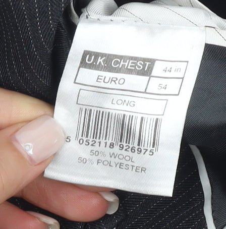 Elevate your formal wardrobe with this Jeff Banks black blazer, tailored for the modern man. Crafted from a blend of 50% wool and 50% polyester, this blazer promises both style and comfort. Its striking striped pattern brings a touch of sophistication, perfect for business meetings, formal events, or a night out. The long jacket length provides a sleek silhouette, ensuring you look polished and professional. Featuring a classic two-button front and double-vented back, this blazer is designed to offer flexibility and ease of movement, making it a staple for any man's closet. Four-button sleeves add to its refined appeal. Despite being pre-owned, this blazer is in excellent condition with no visible wear or damage, making it a smart investment for your formalwear collection. Pair it with matching trousers or dress it down with jeans for a versatile look that works both in a corporate environment and at social gatherings. Don’t miss out on adding this timeless piece to your collection.