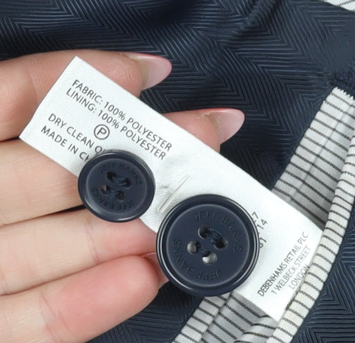 Elevate your formal wardrobe with this classic Jeff Banks men's blazer in a sophisticated blue shade. Designed for the modern gentleman, this single-breasted blazer offers a versatile regular fit, ideal for business meetings or formal occasions. The blazer features a comfortable 44 chest size and falls under the regular size type, ensuring a polished appearance. Constructed with high-quality 100% polyester, both the outer shell and the lining provide a sleek look and substantial feel, while maintaining ease of care with a dry clean only requirement. Adorning this impeccably tailored piece are functional inner pockets for added practicality. The two-button front closure and four-button sleeve detail exude timeless style, perfectly complemented by notch lapels and a double-vented back for optimal movement. This blazer's elegant no-pattern design aligns with an array of classy events in any season, particularly suited for spring and autumn wear. Embrace the elegance of Jeff Banks tailoring with this exceptional men's blue blazer, and make a lasting impression at your next formal gathering.