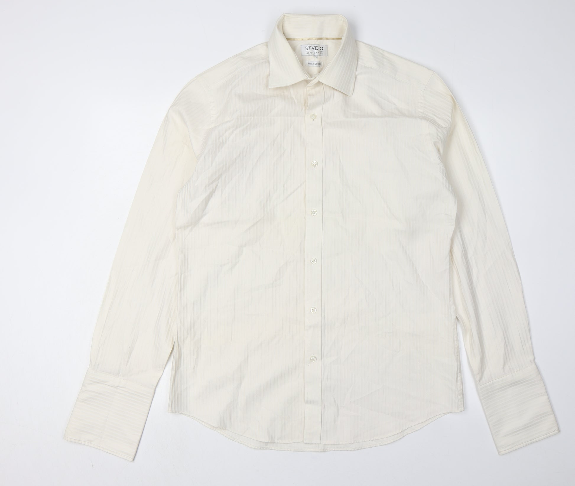 Elevate your wardrobe with this elegant men's shirt by STVDIO Jeff Banks. Crafted from pure cotton, this ivory button-up shirt offers a timeless style suitable for formal occasions. Its solid pattern and long sleeves provide a classic look that easily pairs with your favorite suit or smart trousers. Designed for men, the collared neckline and button closure add sophistication, making it an excellent choice for business meetings or upscale events. The shirt, sized at 15.5, ensures a comfortable fit. Despite slight creasing, it is in excellent condition, ready to impress. A must-have for any stylish gentleman seeking quality and style for both professional and formal settings.